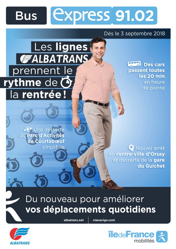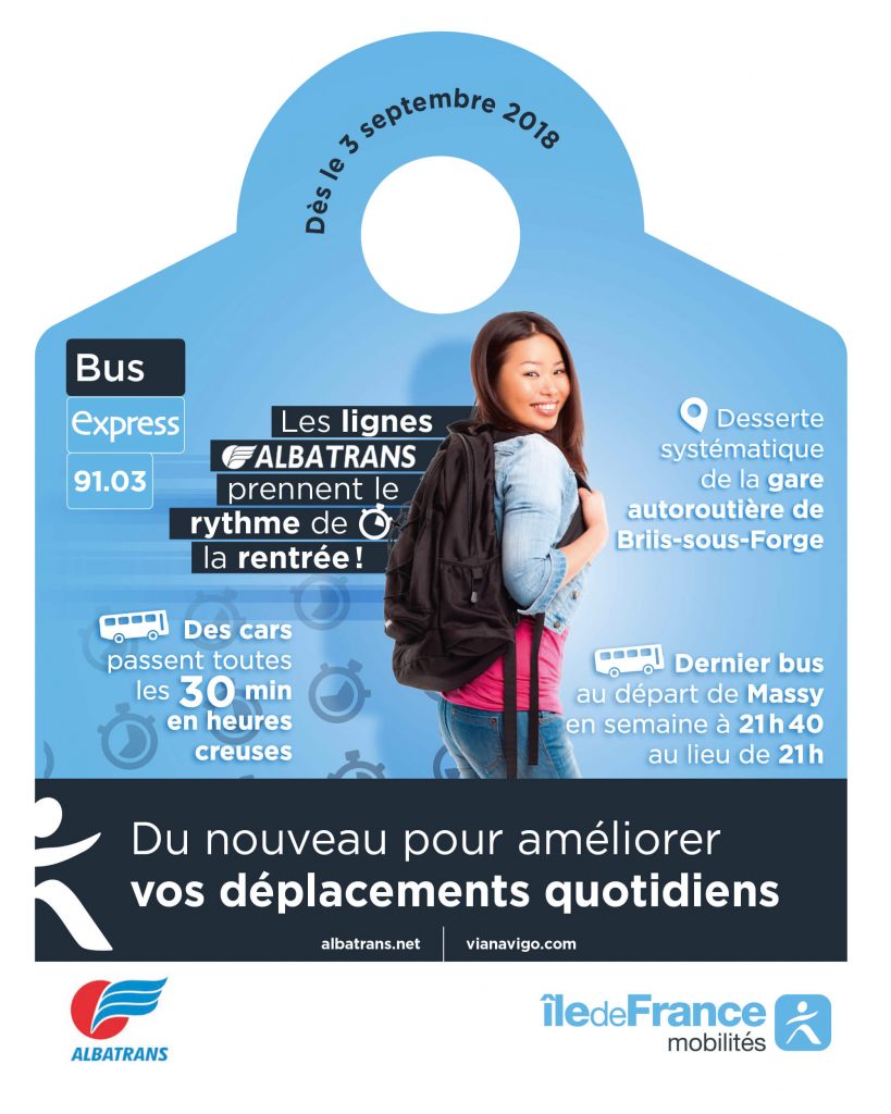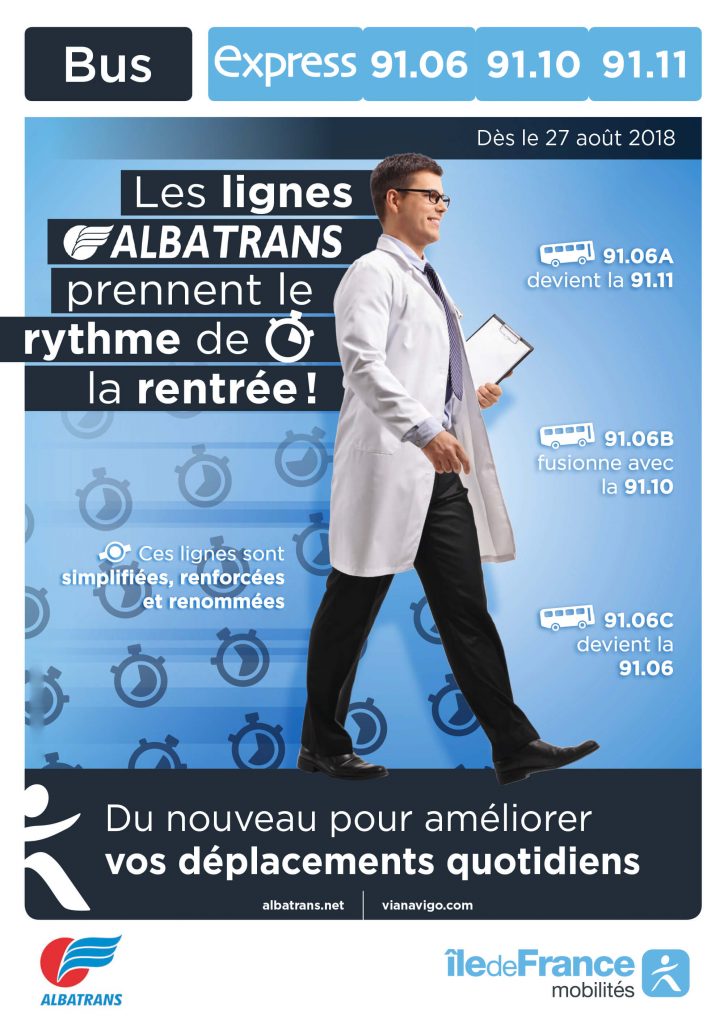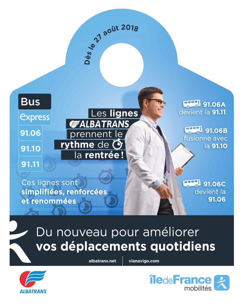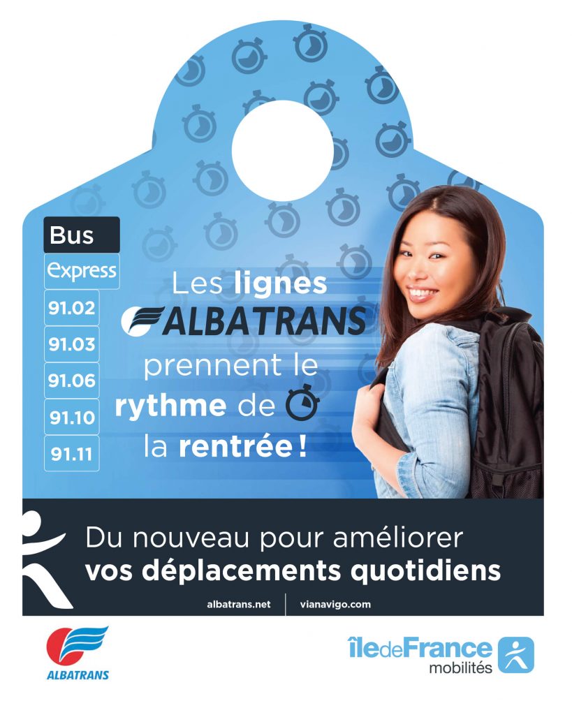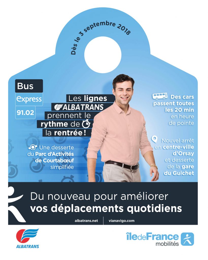 Conception et réalisation de la campagne promotion des lignes Express 91 en 3 modèles d’affiches A3 et 3 modèles d’affichettes suspendues à bord des bus pour le réseau de bus Albatrans en 2018.