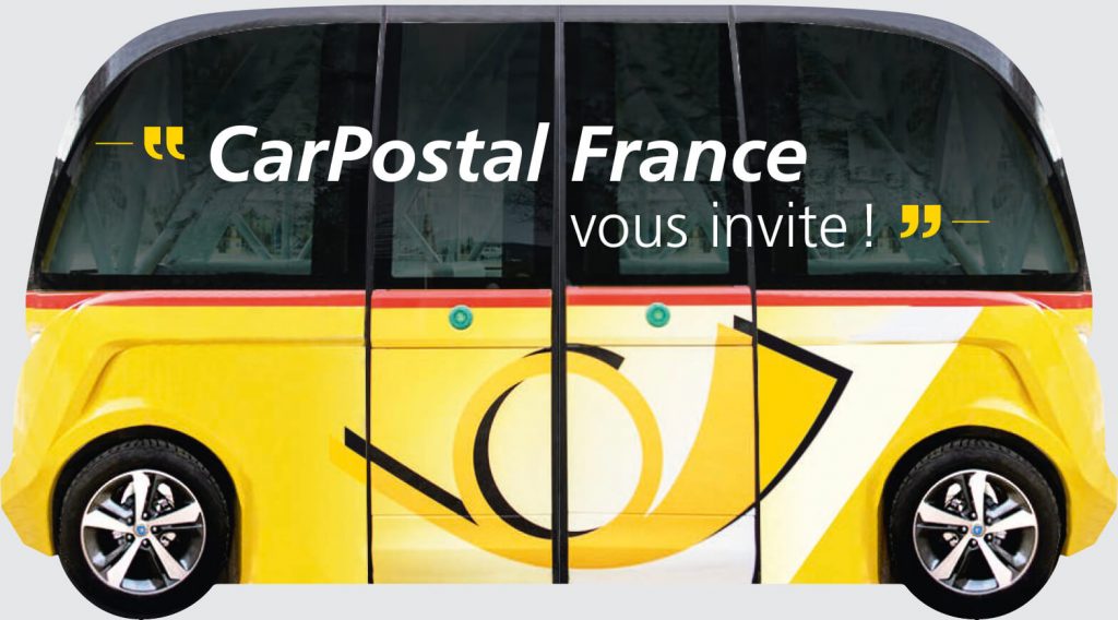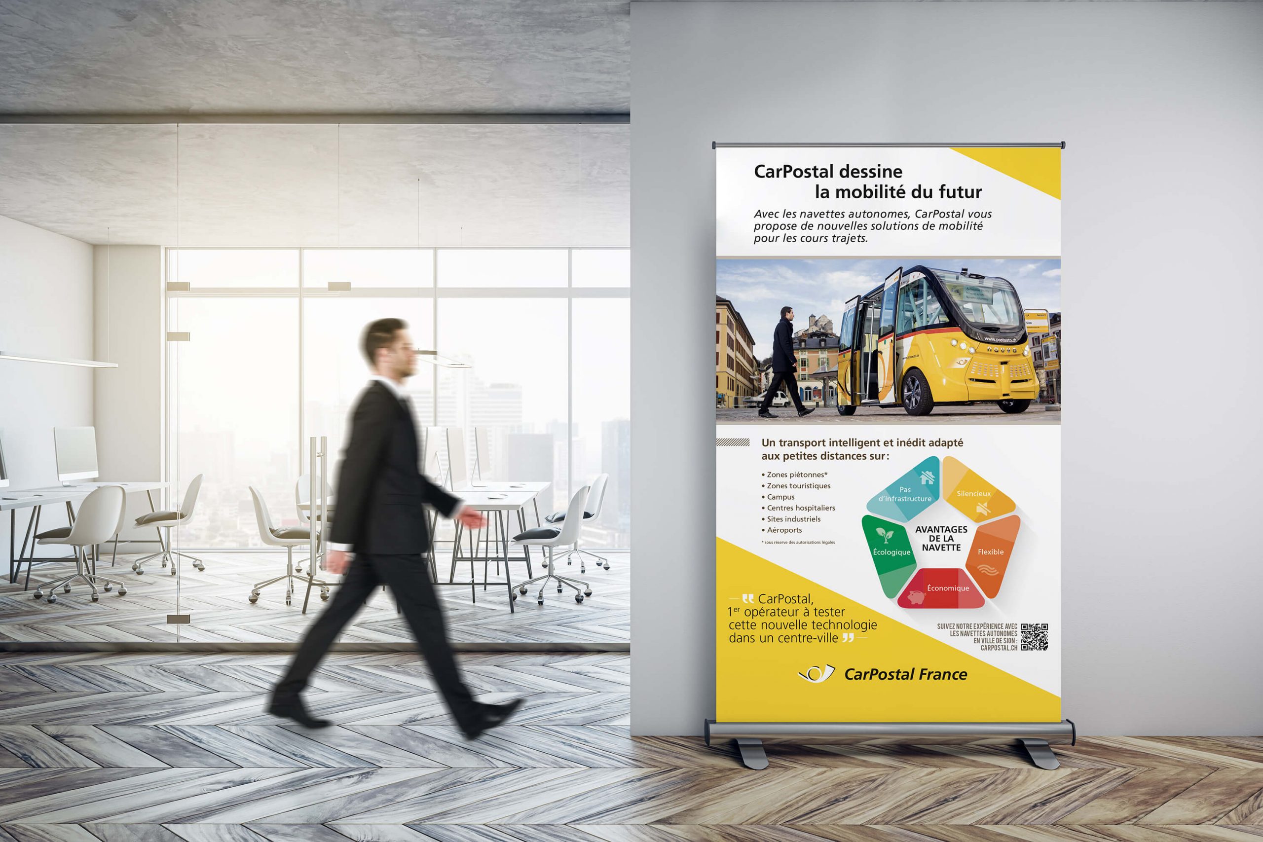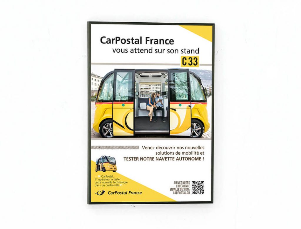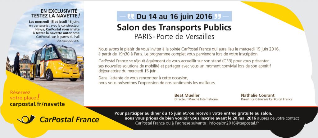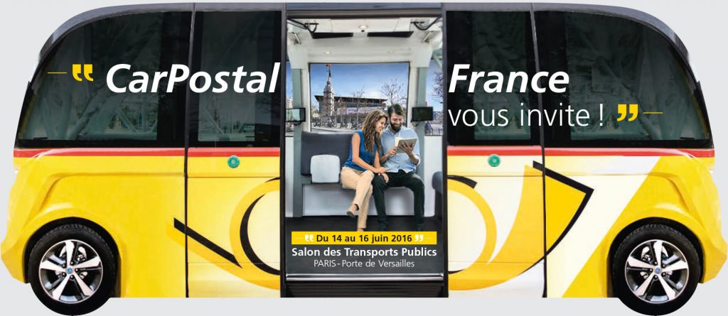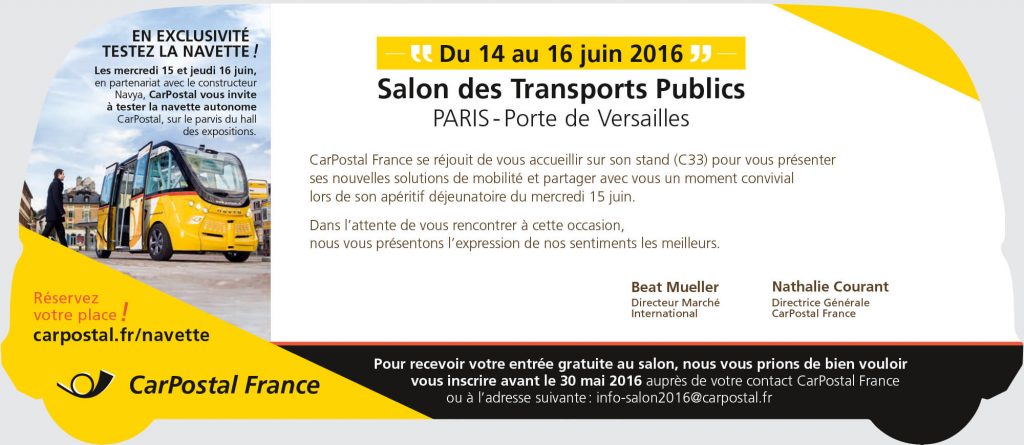 Création de cartons d’invitation (avec cinématique d’ouverture des portes de la navette autonome), affiches et kakémono de stand à l’occasion de l’évènement du Salon des transports publics situé Porte de Versailles à Paris du 14 au 16 juin 2016 pour CarPostal France.