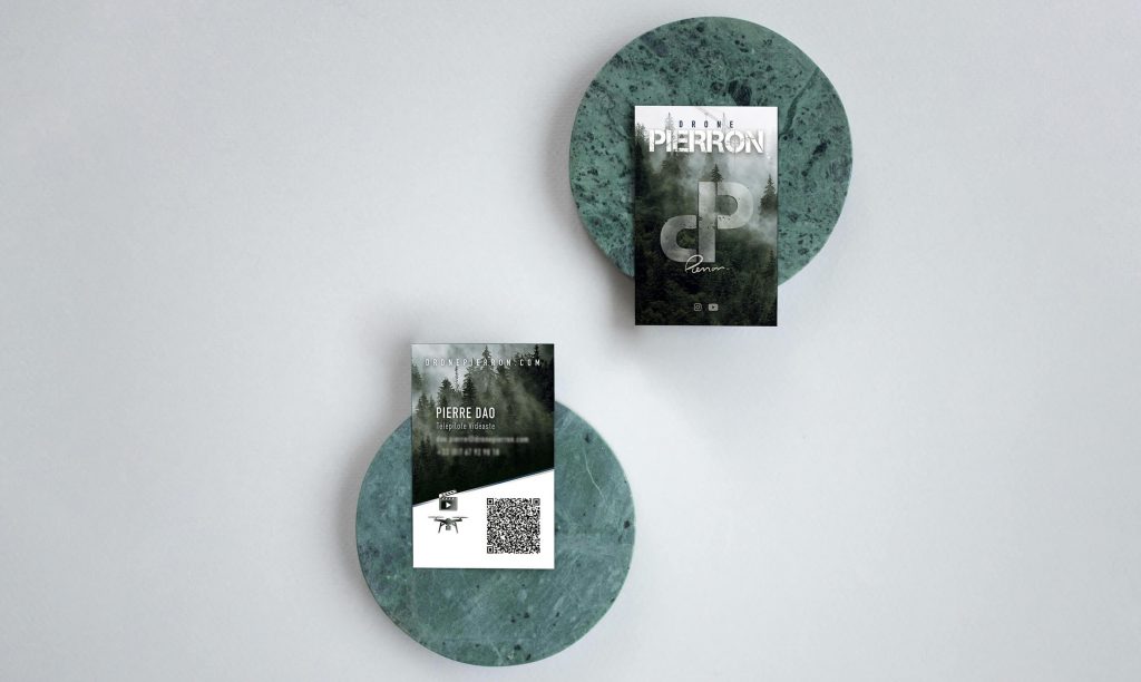 Conception et suivi d’impression des cartes de visite du vidéaste et pilote de drone : Drone Pierron en 2024.