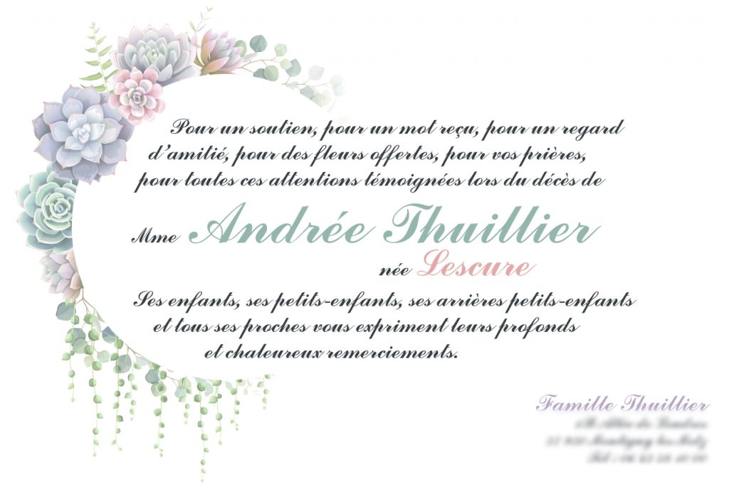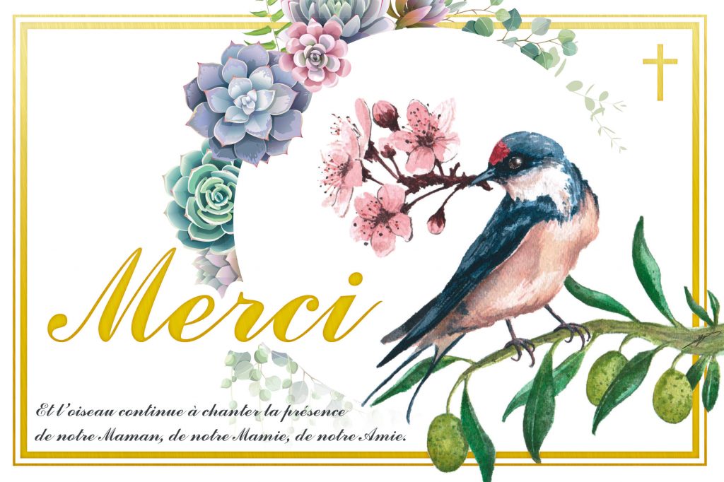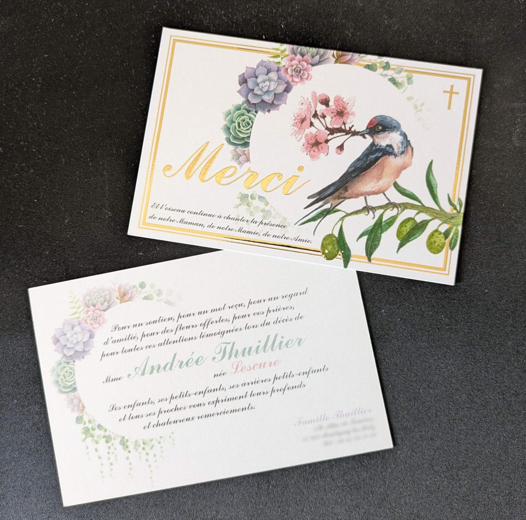 Réalisation du faire-part de décès de Mme Thuillier Andrée en 2020. Réalisation d’une peinture aquarelle faite à la main et mise en page de la carte sur papier nacré avec un laminage Or.