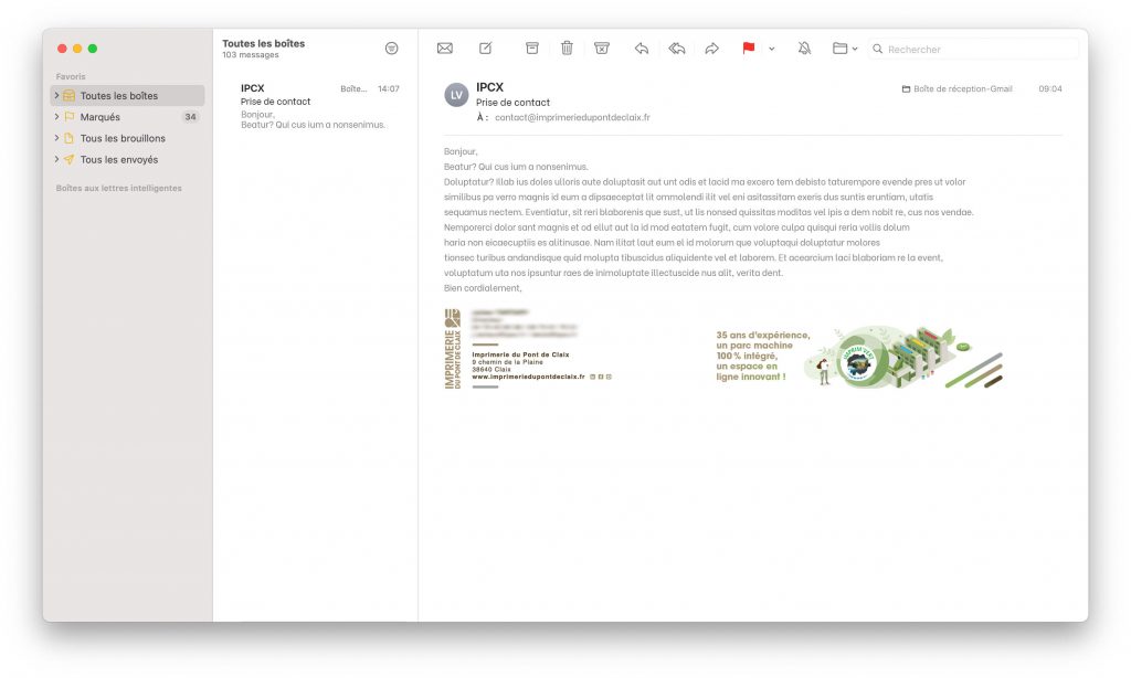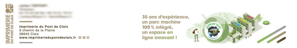 Création et programmation HTML des signatures de mail de l’ensemble du personnel de l’entreprise comprenant une bannière Eco-responsable pour l’Imprimerie du Pont de Claix en 2023.