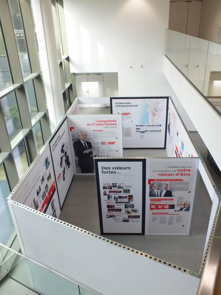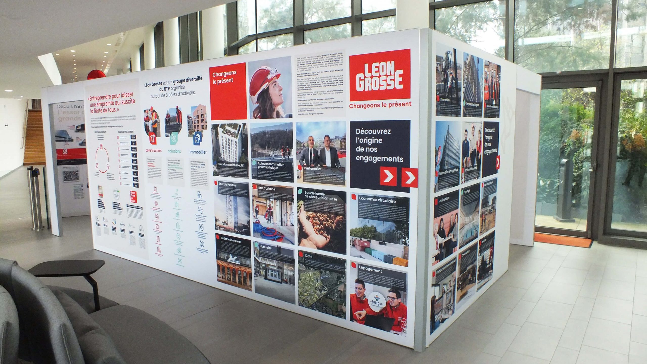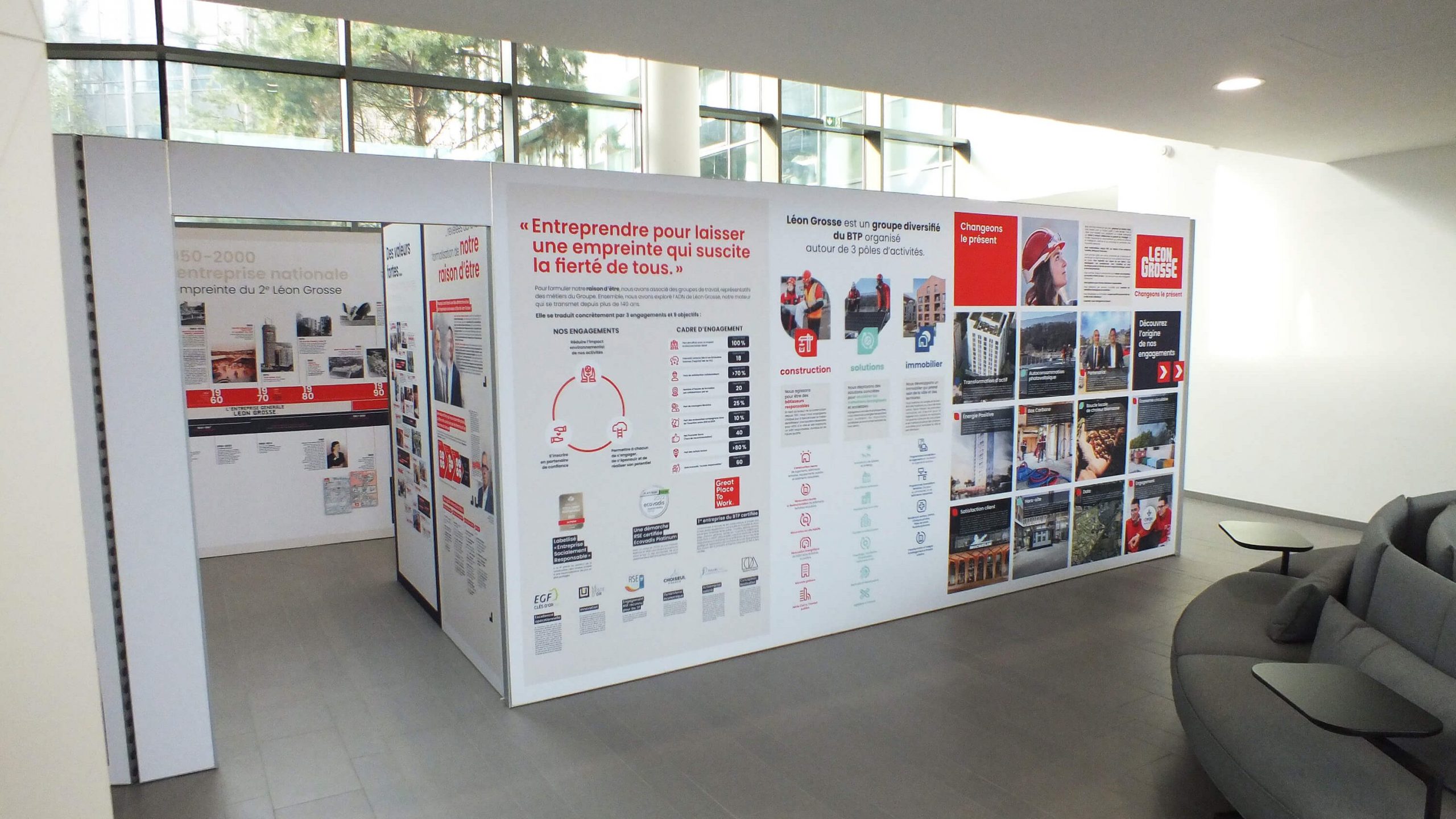 Conception et réalisation de la scénographie d’un parcours immersif afin de plonger les visiteurs dans l’histoire de l’entreprise Léon Grosse en 2023. Implantation dans le hall du siège de l’entreprise à Versailles.