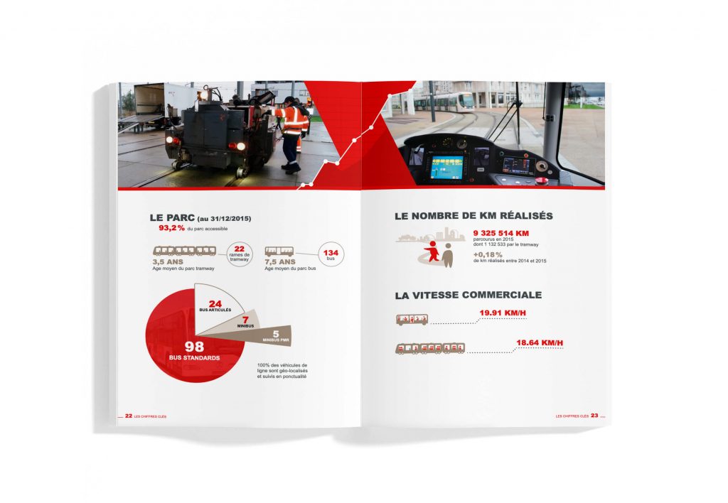 Mise en page du rapport d’activité du réseau pour le compte du réseau de transport LiA (Le Havre) en 2015.