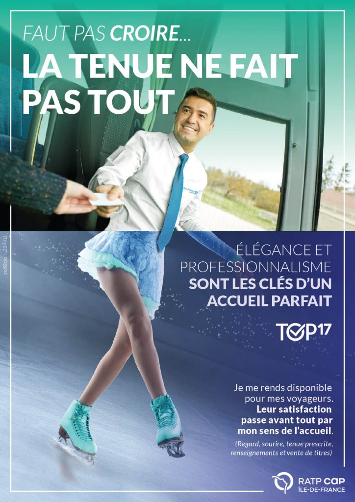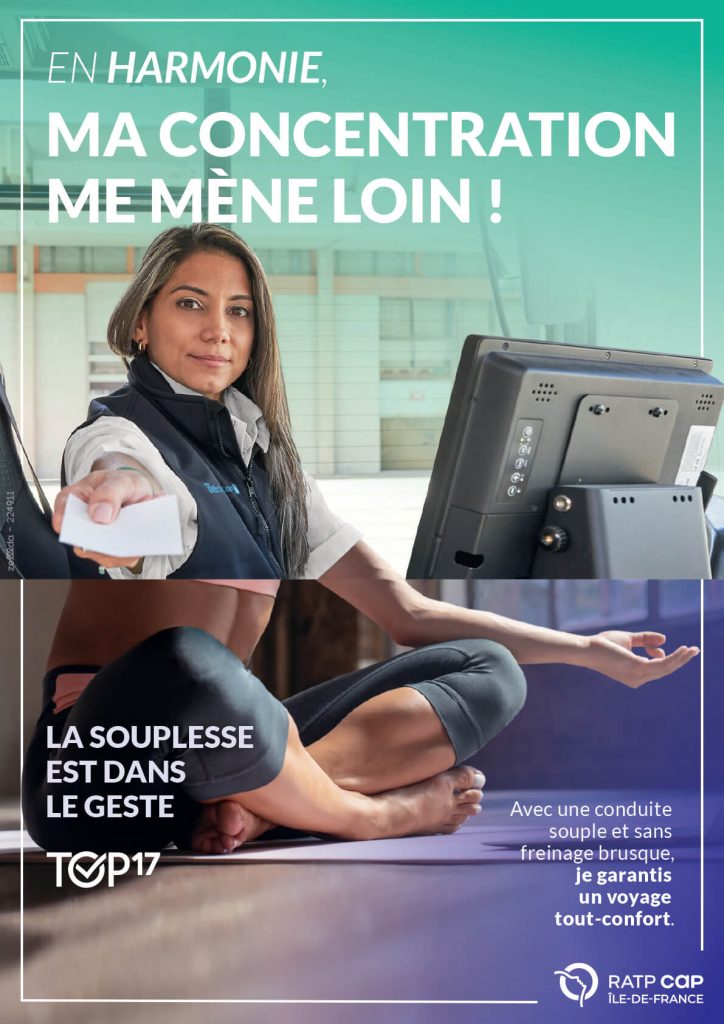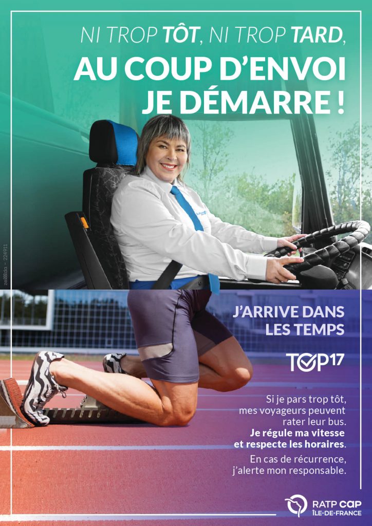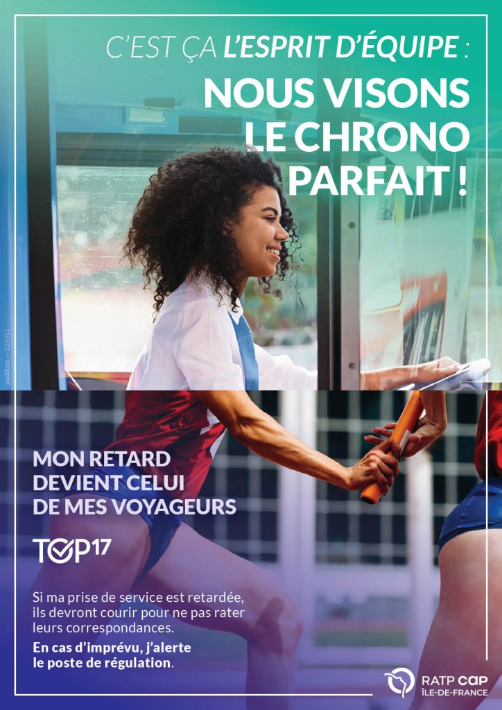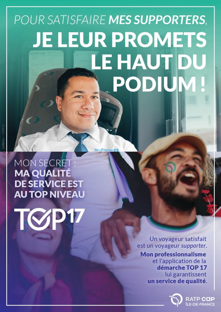 Création du nouveau logo de la charte de qualité de service Top 17. Réalisation d’une campagne interne d’affichage, vidéo diffusée dans les salle de repos afin de sensibiliser le personnel. Concept d’analogie avec des sports collectifs pour remporter la confiance des clients usagers et clients autorités organisatrices pour RATP CAP en 2022.
