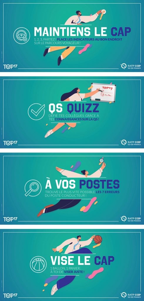 Réalisation de la campagne interne de sensibilisation à la qualité de service 2023 pour RATP CAP ainsi que l’ensemble des supports événementiels segmentés en 4 ateliers ludiques sur les thèmes du sport dans la continuité de la campagne de l’année précédente également produite par nos soins.