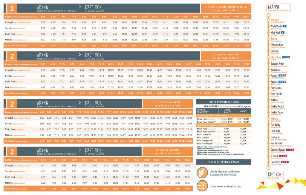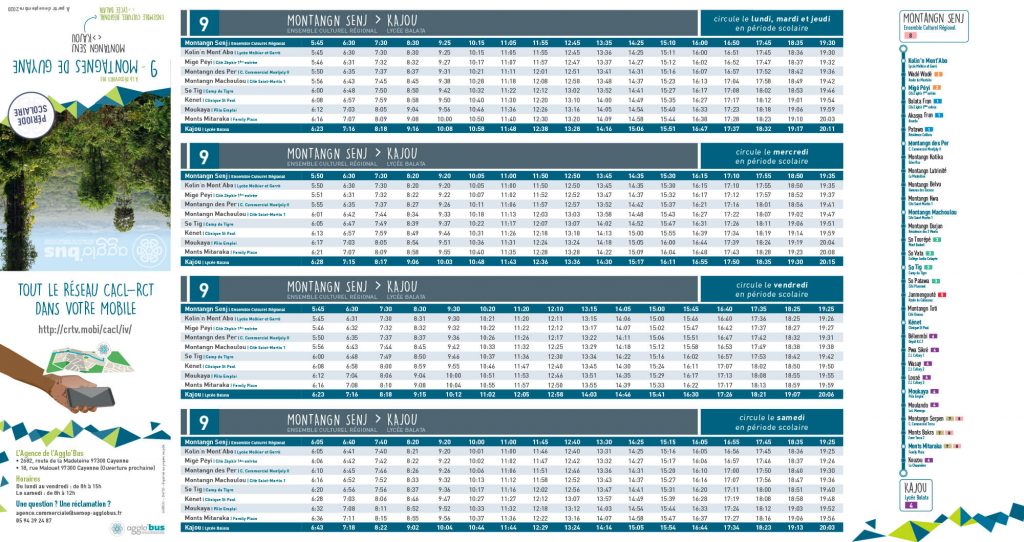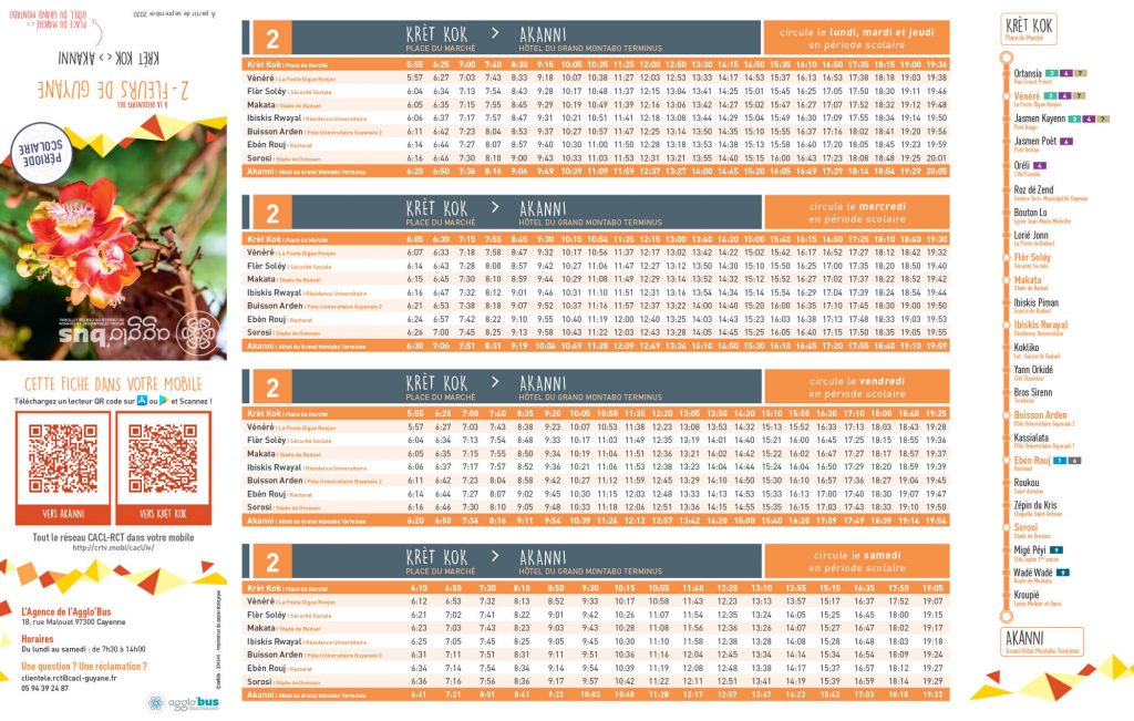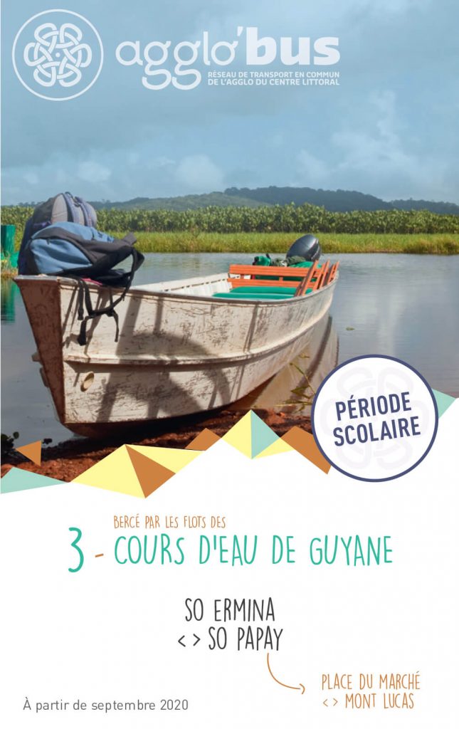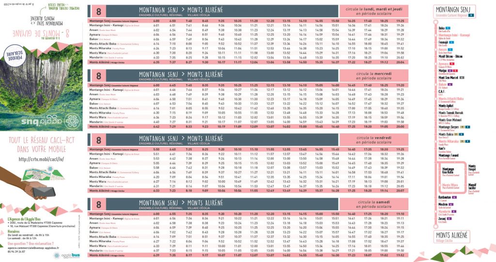 Conception, réalisation et mise à jour de l’ensemble des fiches horaires papier (été + rentrée) des lignes du réseau de bus SEMOP Agglo’bus situé à Cayenne en Guyane de 2019 à 2021.
