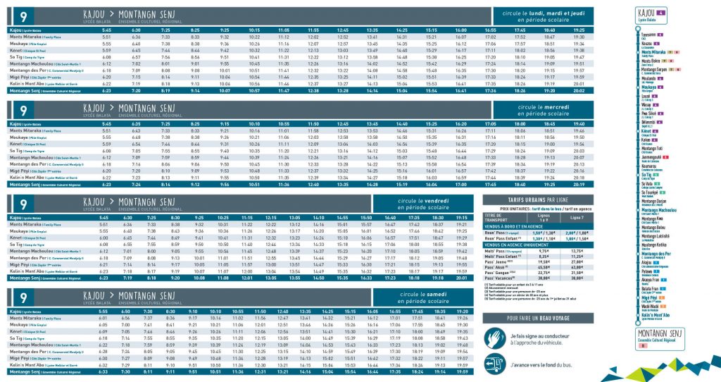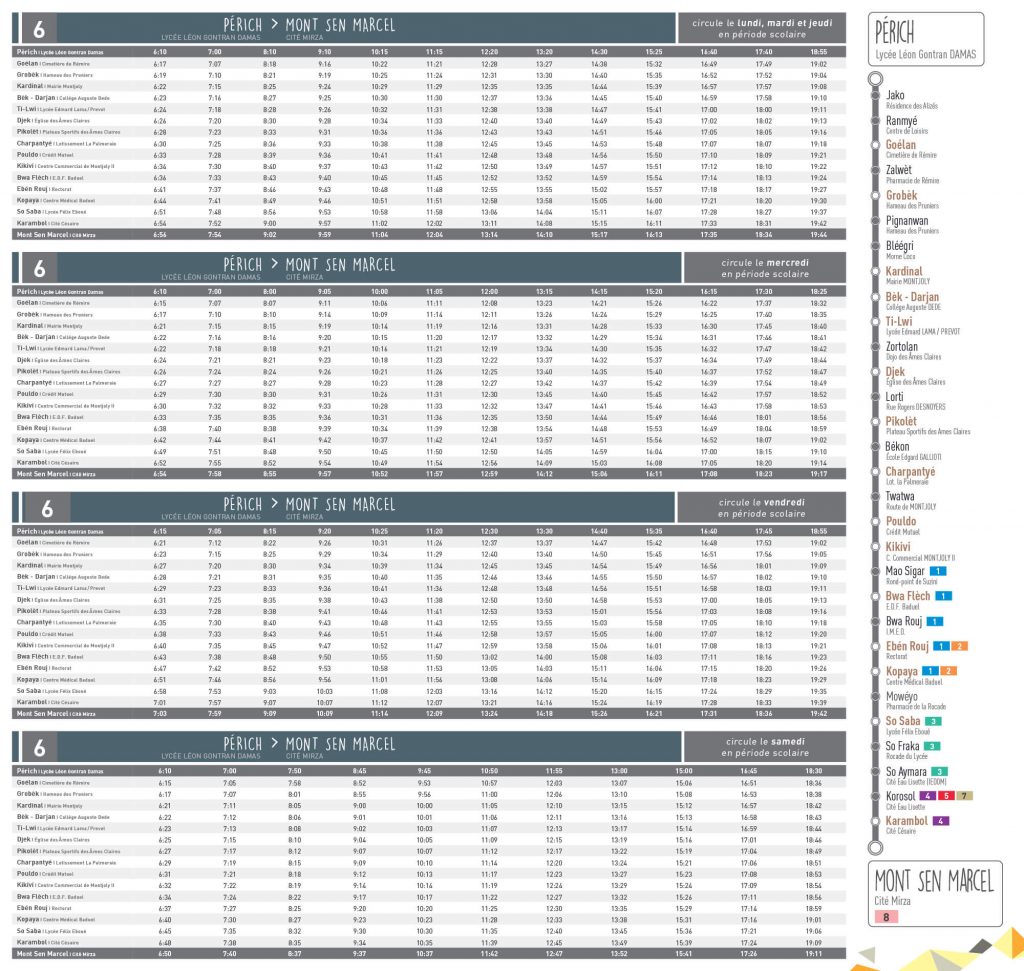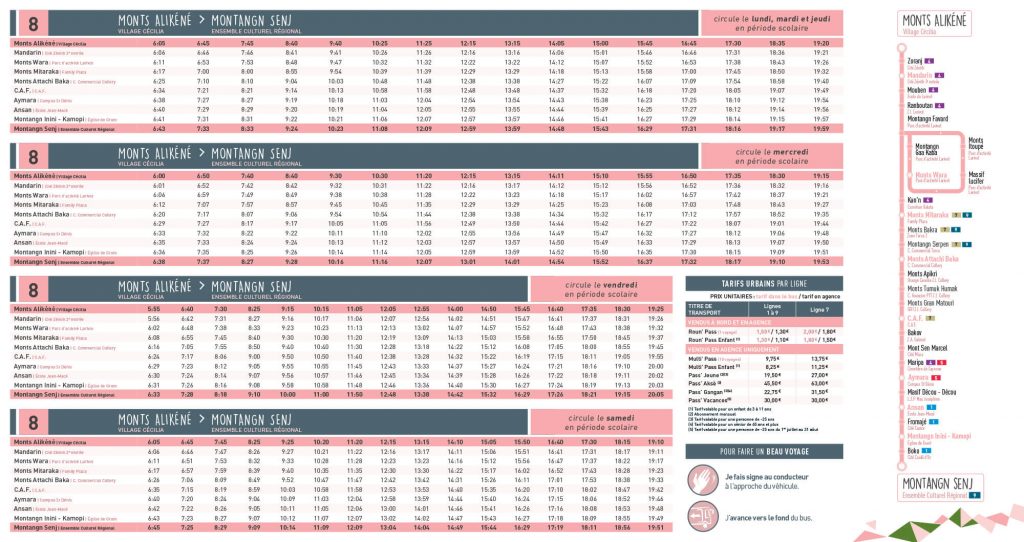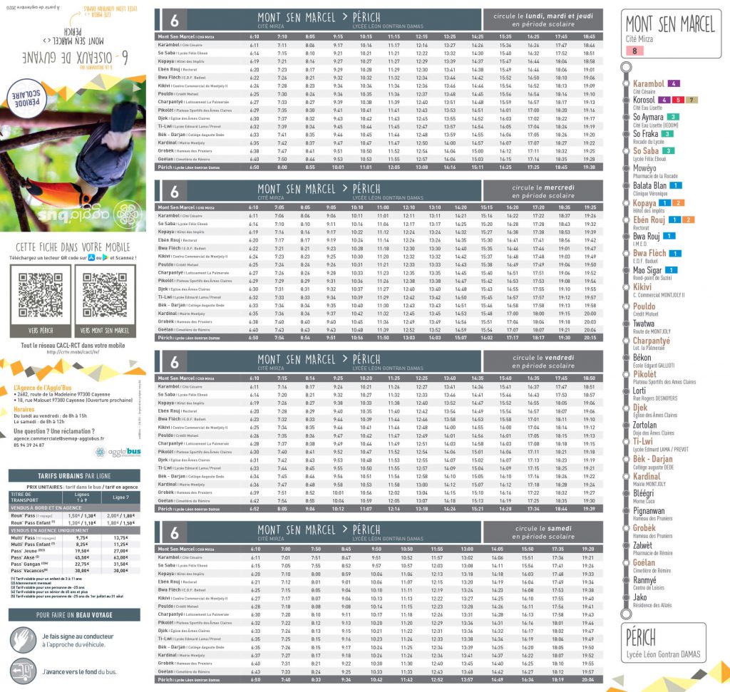 Conception, réalisation et mise à jour de l’ensemble des fiches horaires papier (été + rentrée) des lignes du réseau de bus SEMOP Agglo’bus situé à Cayenne en Guyane de 2019 à 2021.
