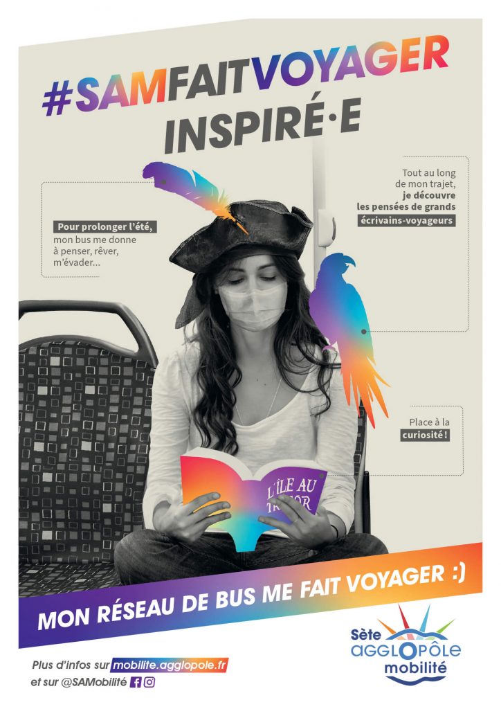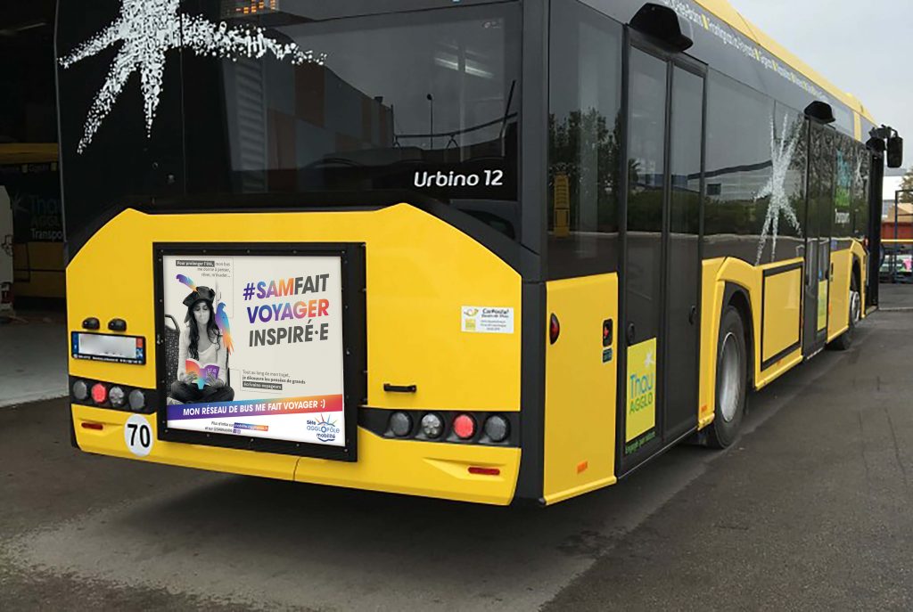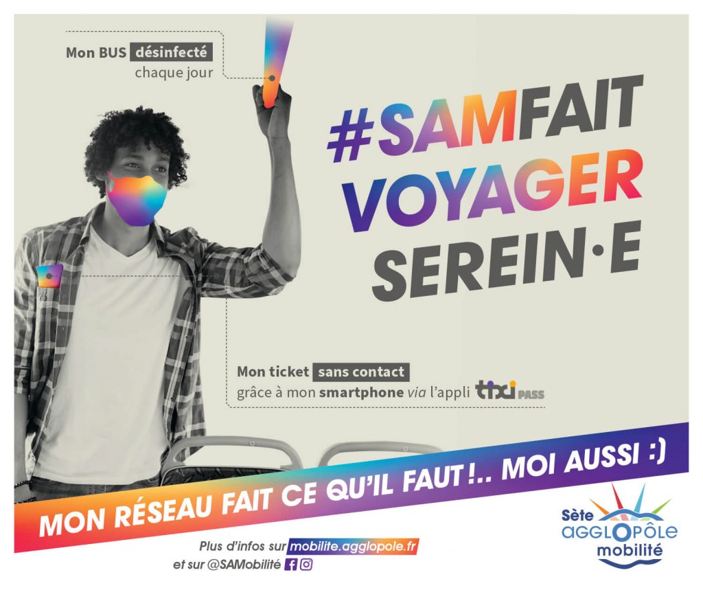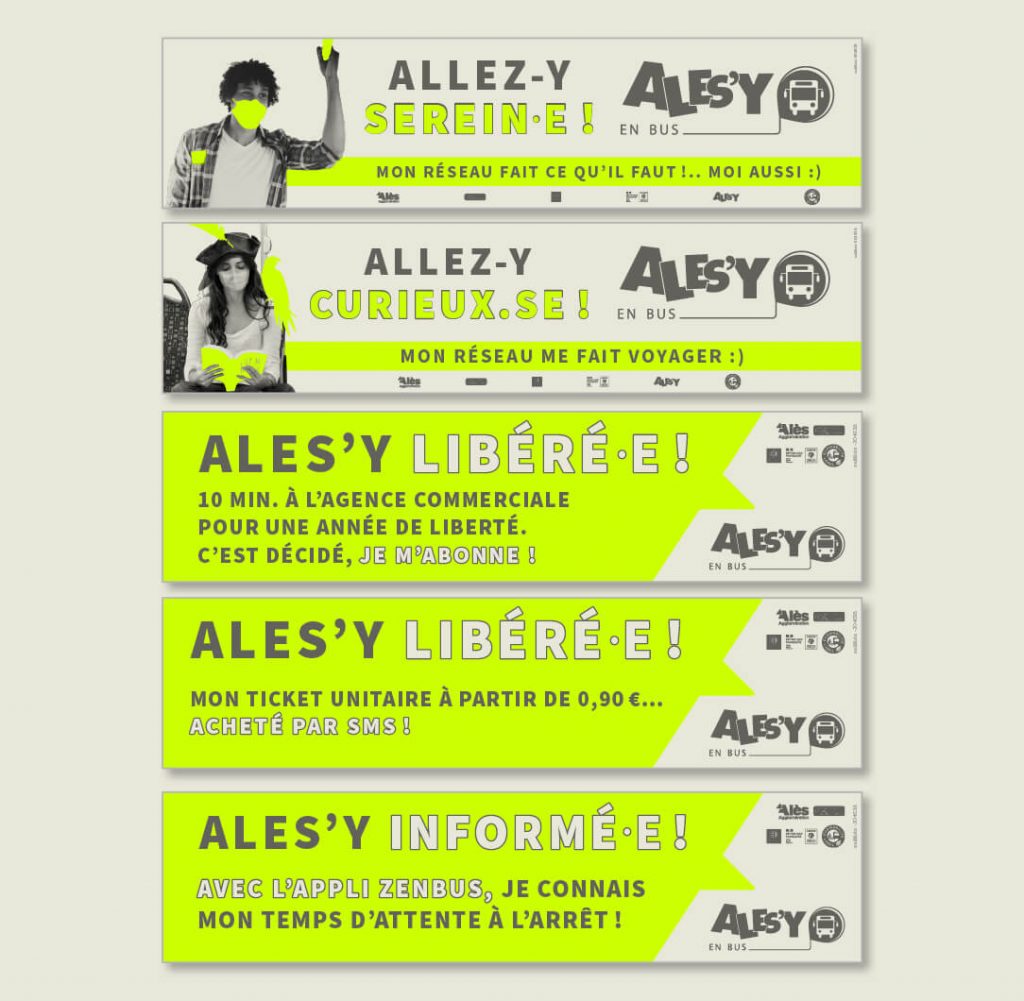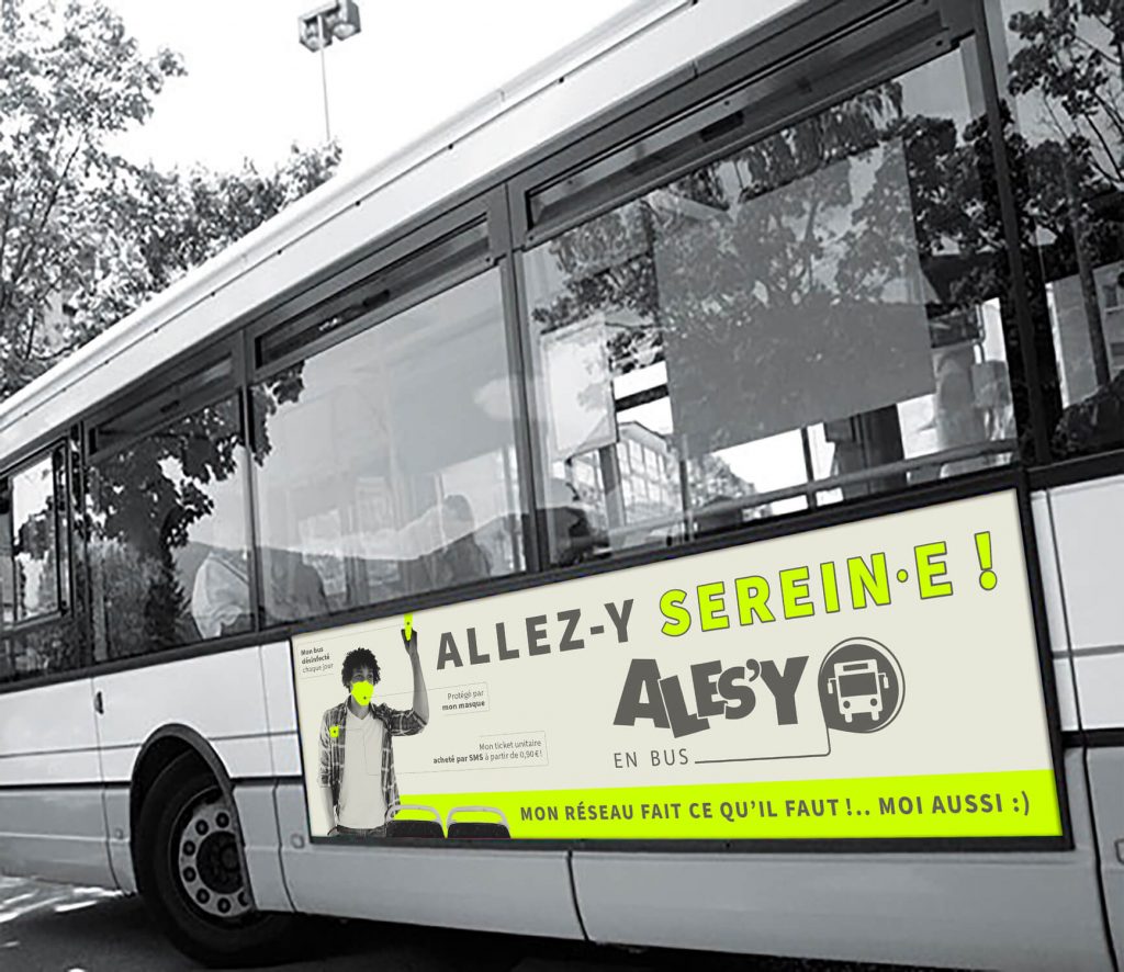 Conception et réalisation de la campagne de lancement rentrée 2020 mutualisée entre les réseaux de Sète Agglopôle Mobilités (en multicolore)et d’Ales’Y (en fluo) en 2020. Dispositif de stickers dans les bus, communication urbaine en 120×176, arrières de bus ainsi que sur réseaux sociaux.