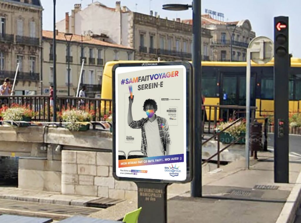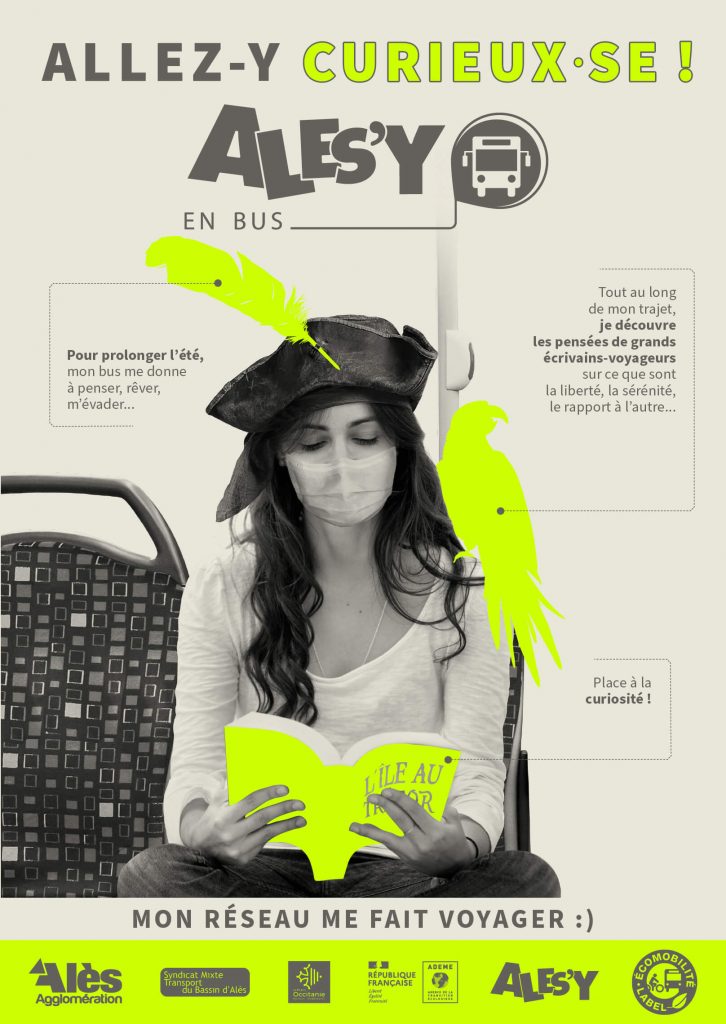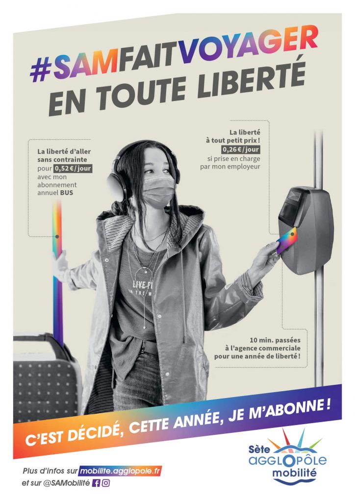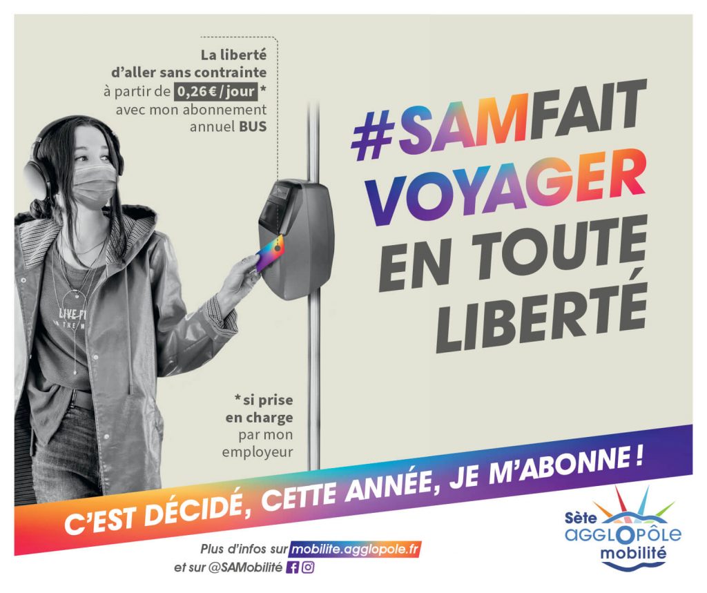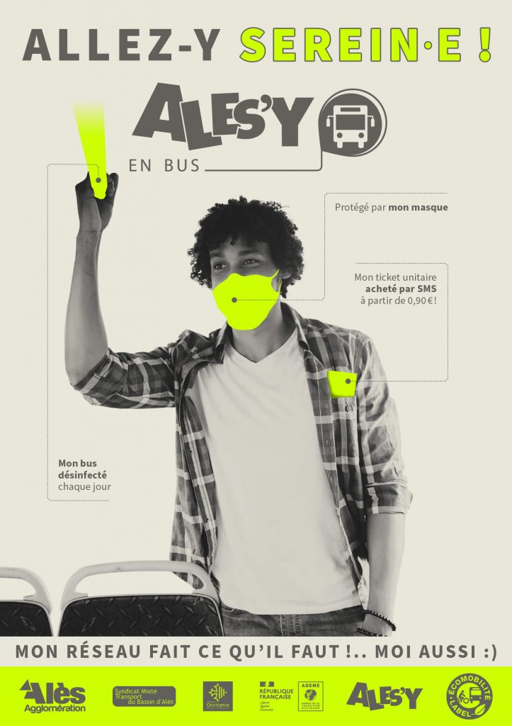 Conception et réalisation de la campagne de lancement rentrée 2020 mutualisée entre les réseaux de Sète Agglopôle Mobilités (en multicolore)et d’Ales’Y (en fluo) en 2020. Dispositif de stickers dans les bus, communication urbaine en 120×176, arrières de bus ainsi que sur réseaux sociaux.