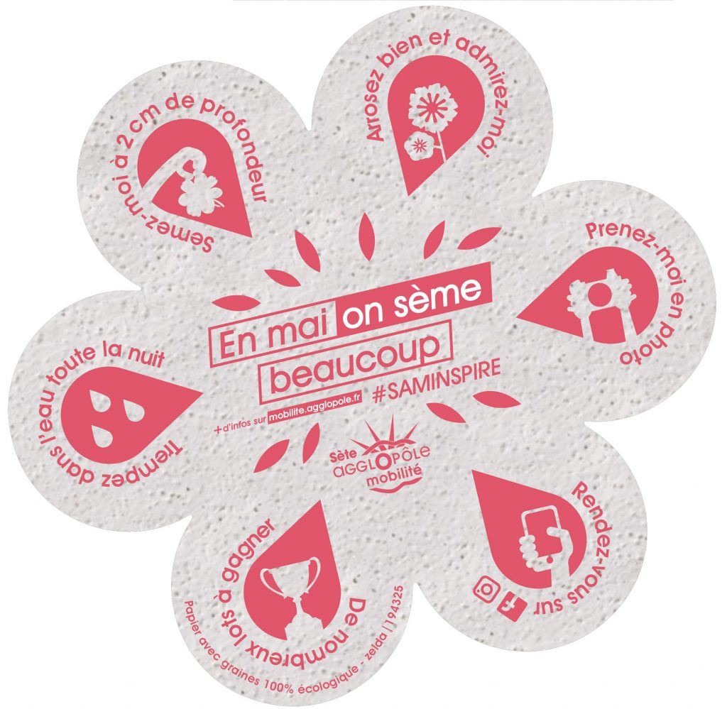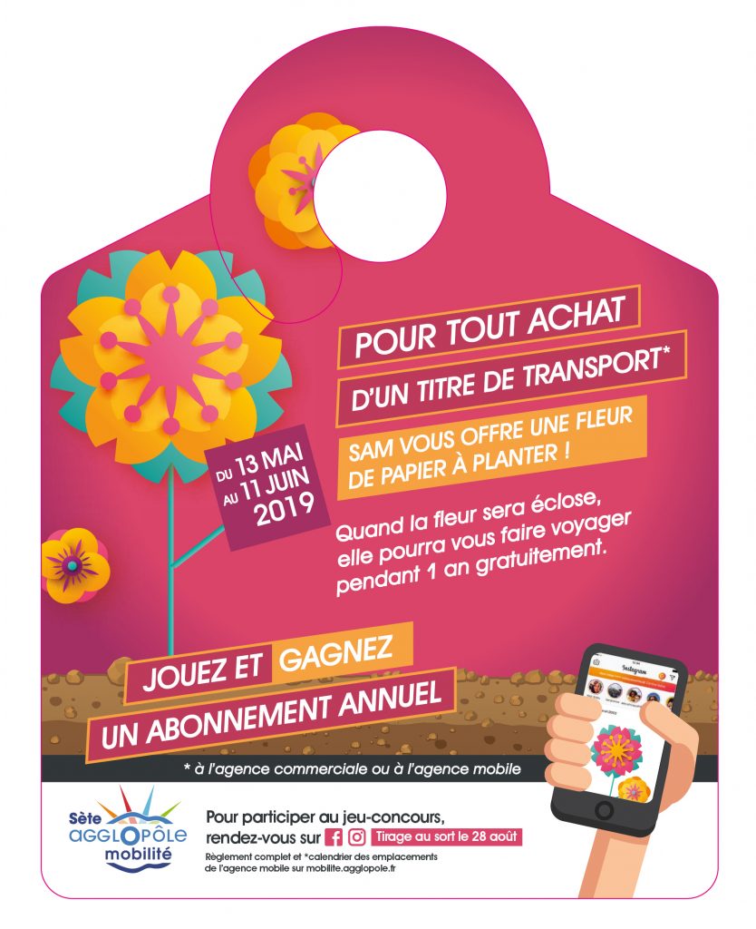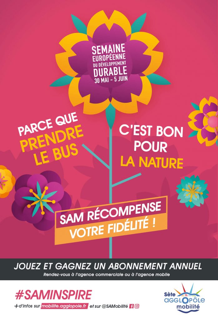 Conception et réalisation de la campagne Semaine Européenne du Développement Durable pour le réseau Sète Agglopôle Mobilités en 2019. Diffusion en affichage A4, affichettes suspendues embarquées, post et motion design pour les réseaux sociaux ainsi que jeu concours avec distribution de flyers écolo imprimés sur papier ensemencé à planter.