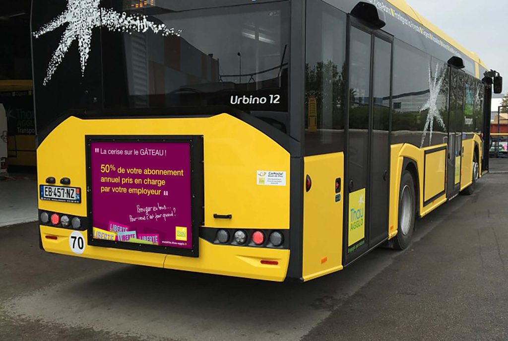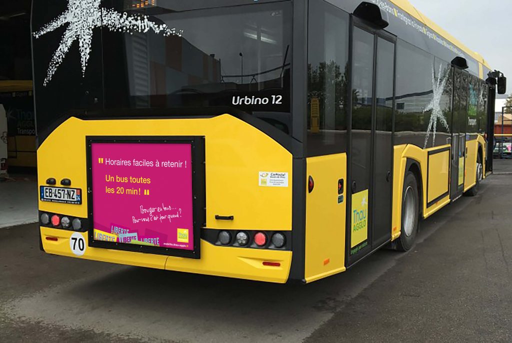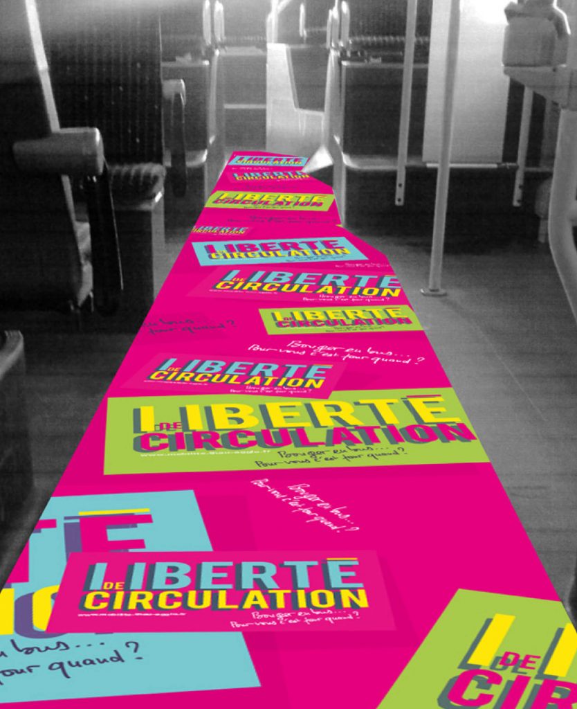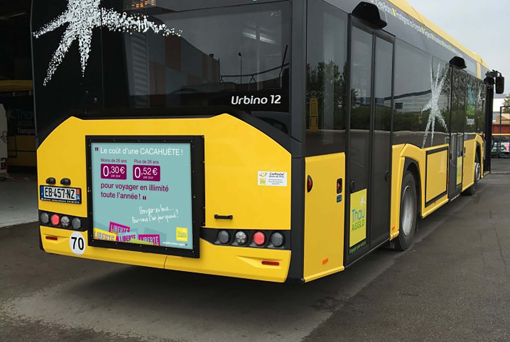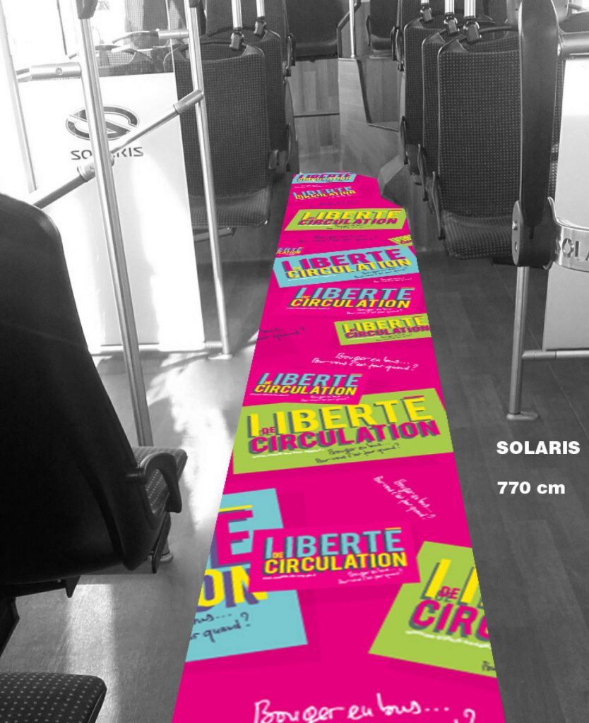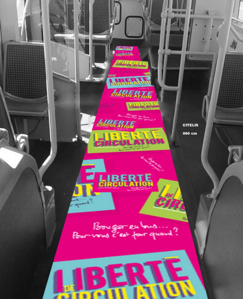 Diffusion en 4×3, 120×176, covering arrière de bus, affichettes suspendues et marquages au sol embarqués.