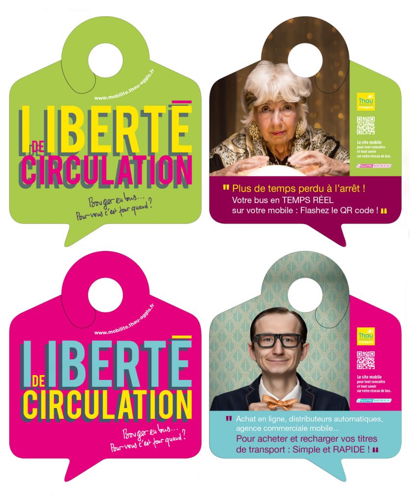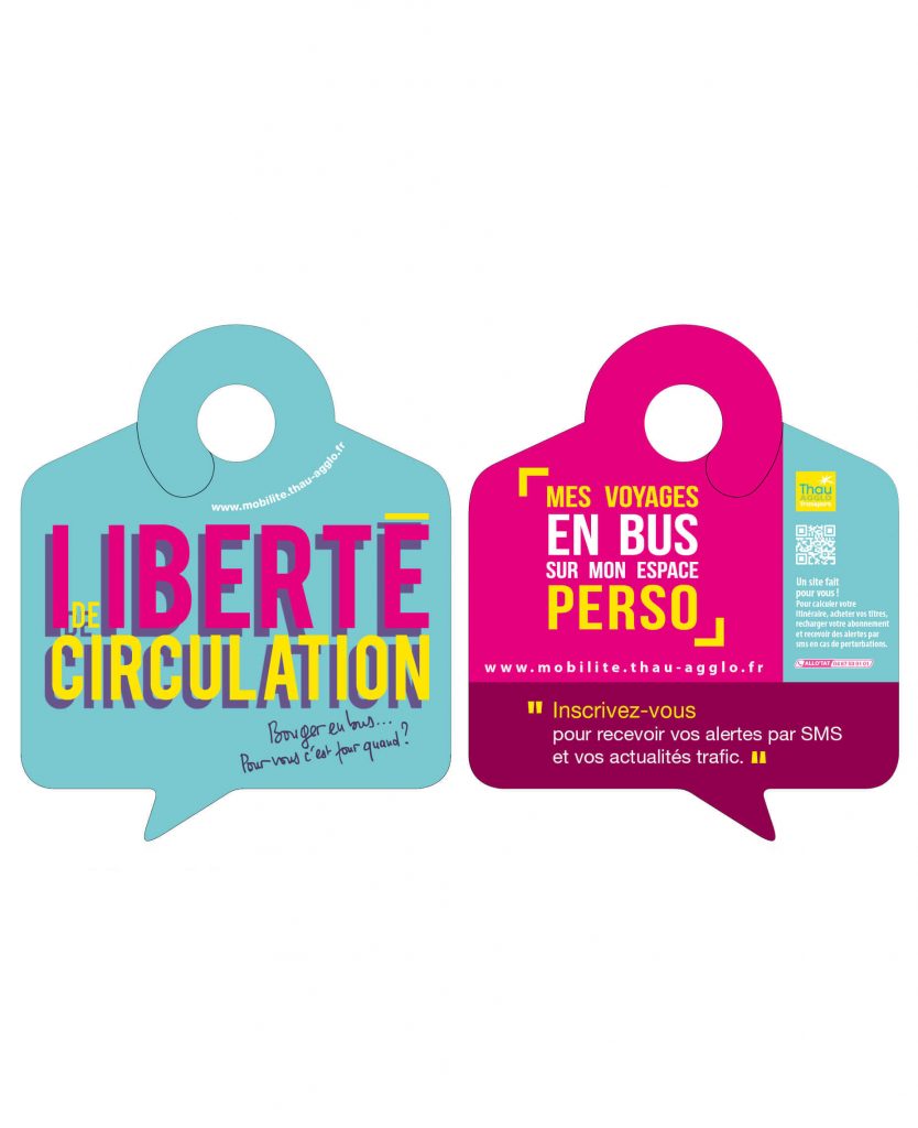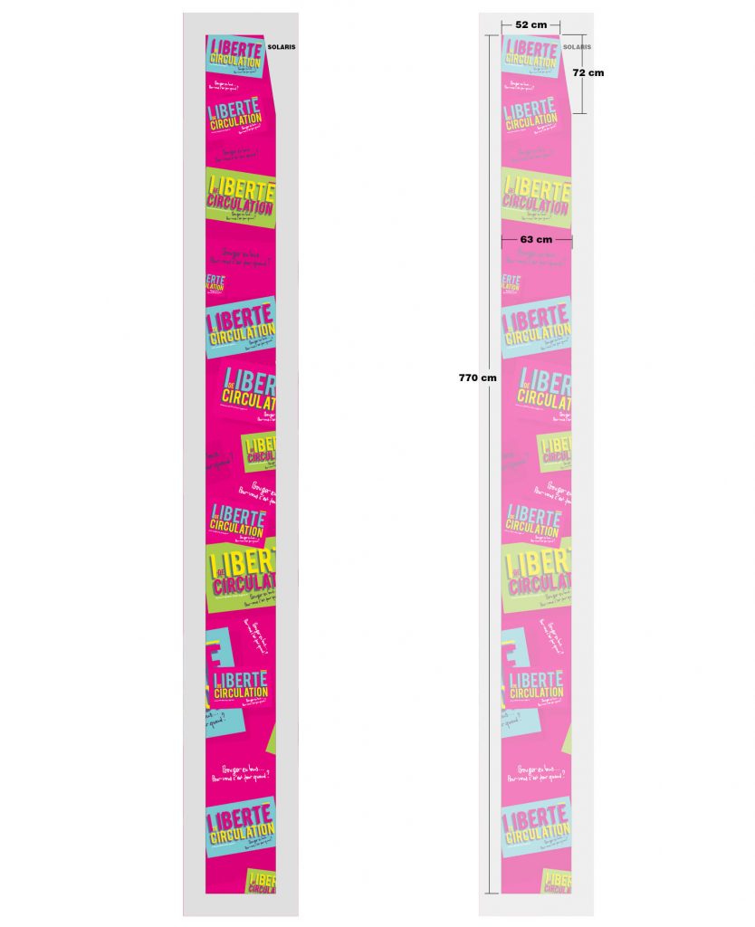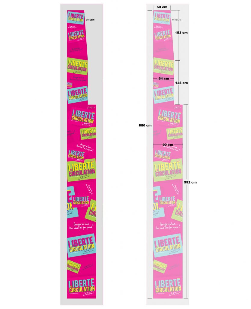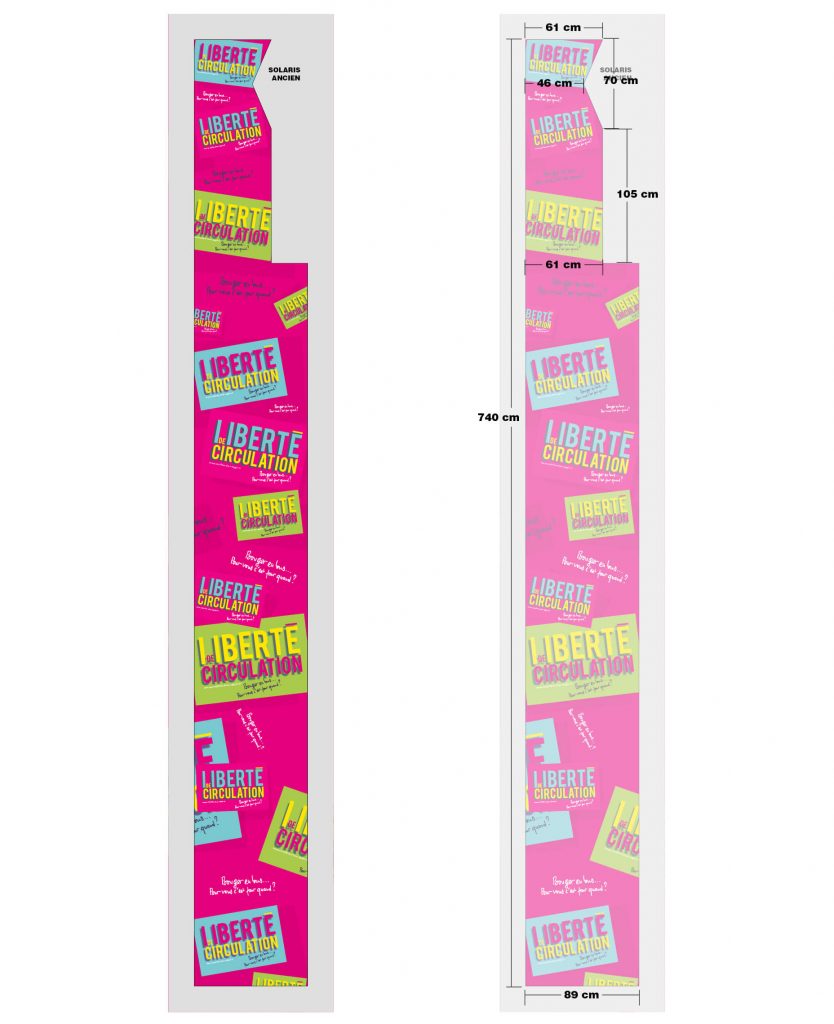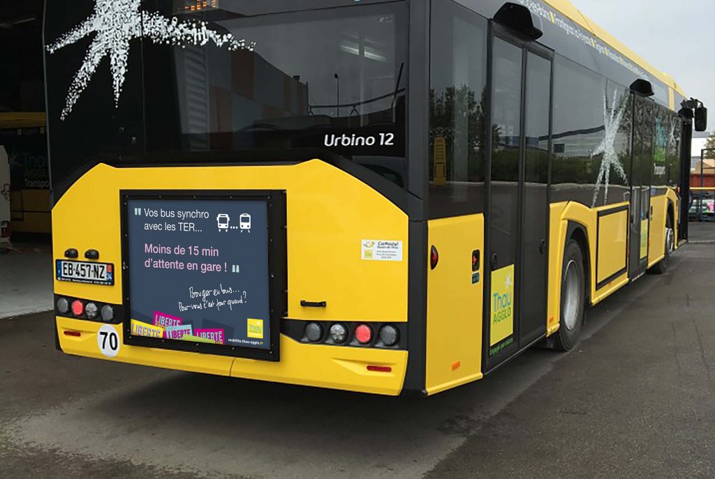 Diffusion en 4×3, 120×176, covering arrière de bus, affichettes suspendues et marquages au sol embarqués.