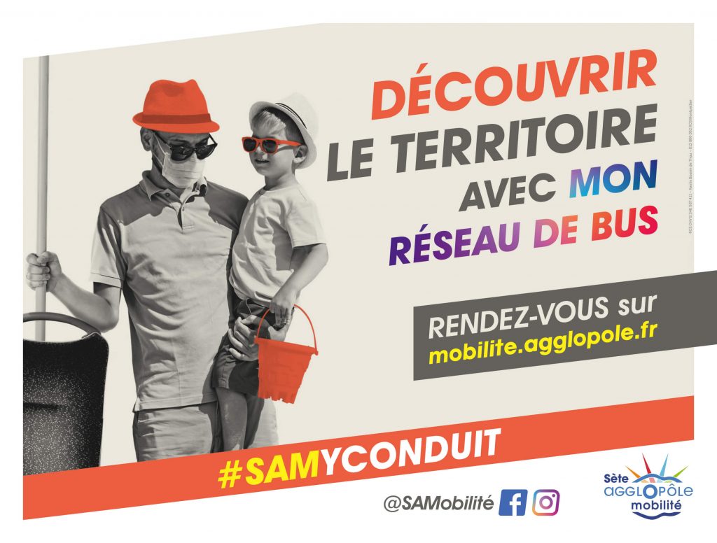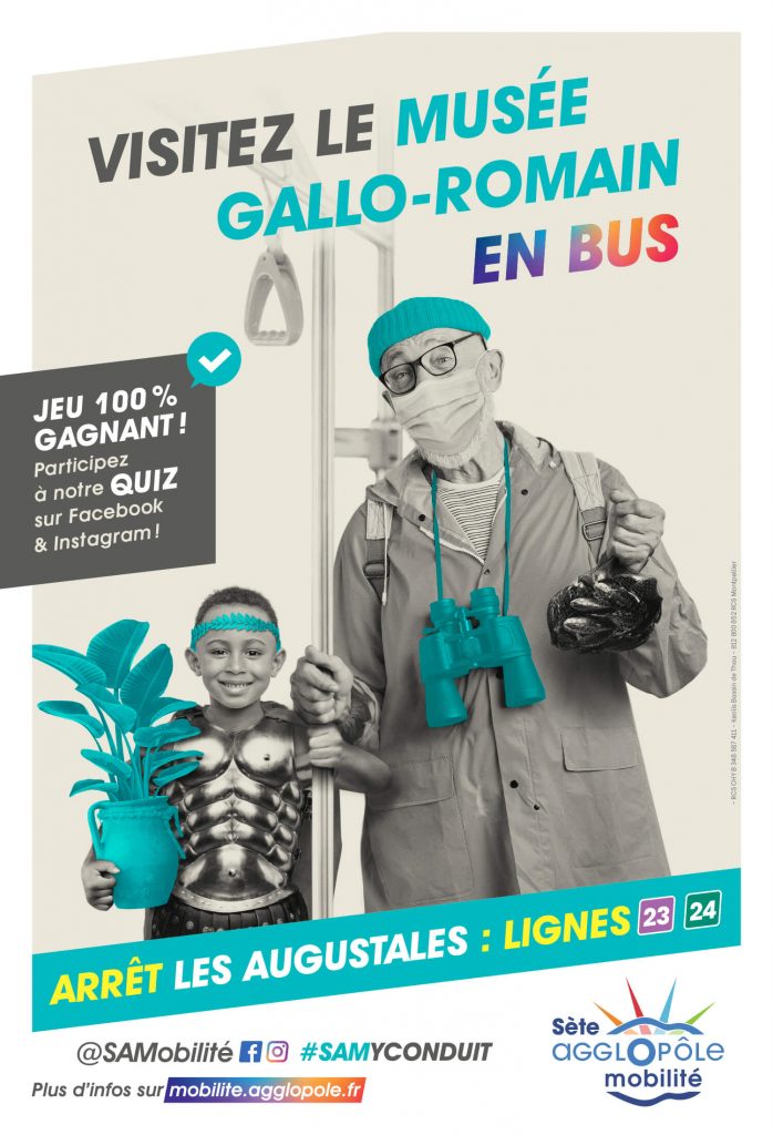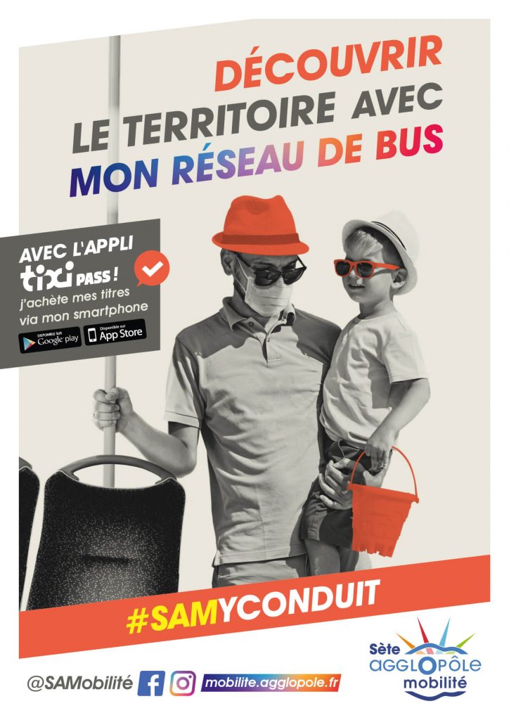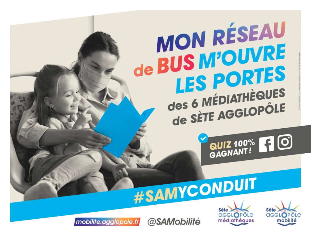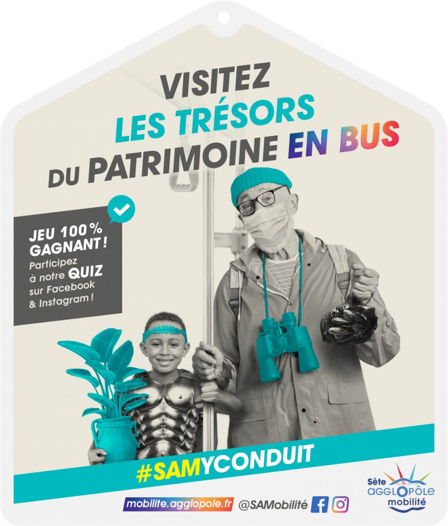 Conception et réalisation des différentes campagnes annuelles pour le réseau Sète Agglopôle Mobilités afin de promouvoir les points forts du territoire : Tourisme, Patrimoine et Médiathèque en 2021. Diffusions urbaines 4×3, 120×176, Affiches A4, A3 et affichettes suspendues embarquées à bord des bus ainsi qu’un jeu concours basé sur la récolte d’informations disséminées sur les affichettes.