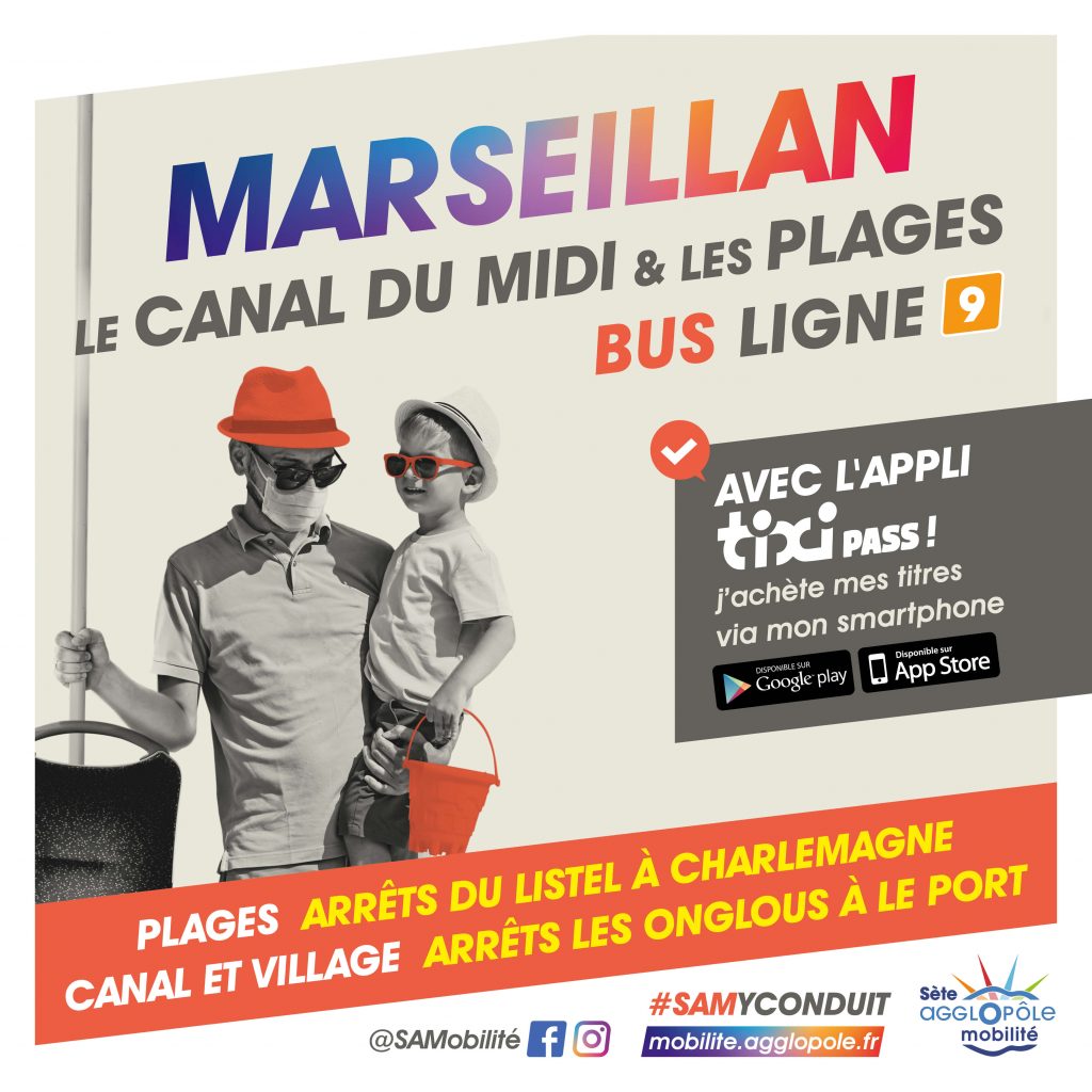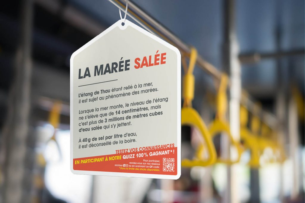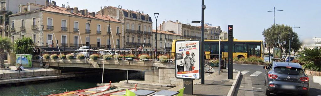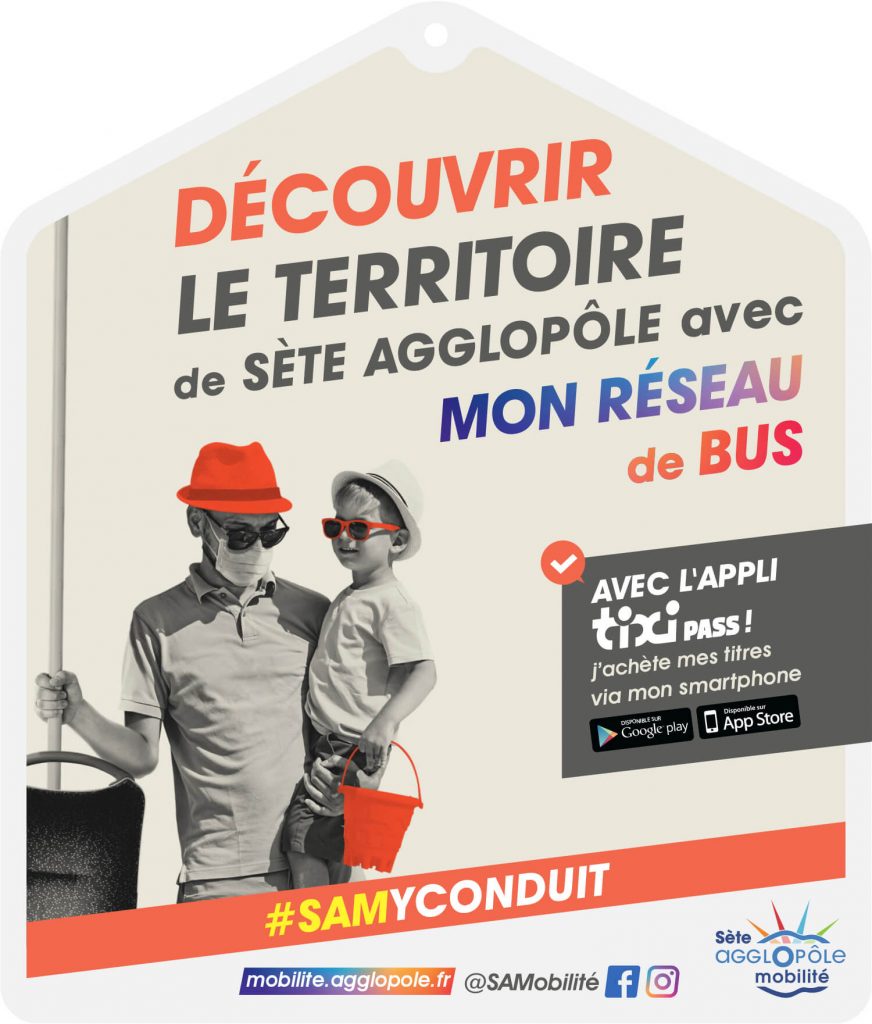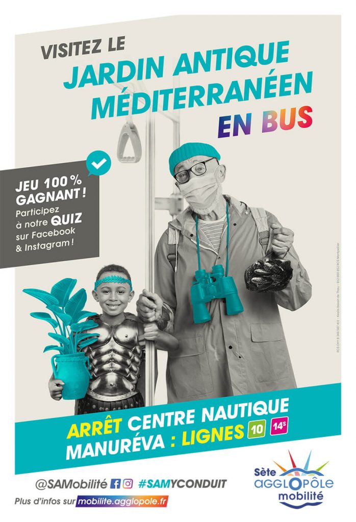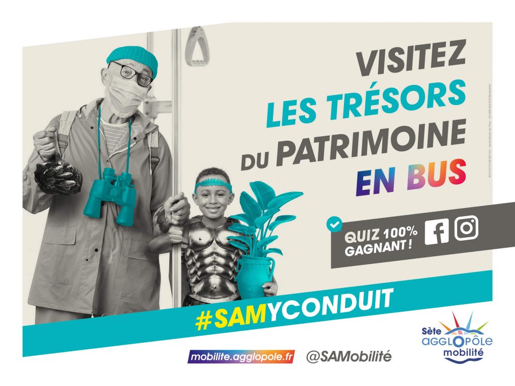 Conception et réalisation des différentes campagnes annuelles pour le réseau Sète Agglopôle Mobilités afin de promouvoir les points forts du territoire : Tourisme, Patrimoine et Médiathèque en 2021. Diffusions urbaines 4×3, 120×176, Affiches A4, A3 et affichettes suspendues embarquées à bord des bus ainsi qu’un jeu concours basé sur la récolte d’informations disséminées sur les affichettes.