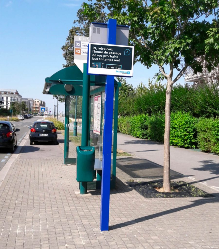 Réalisation des habillages des têtes de BIV (bornes infos voyageurs) à l’arrêt à partir des banques de données visuels et chartes IDFM ( Île-de-France Mobilités) pour Transdev AMV en 2021.