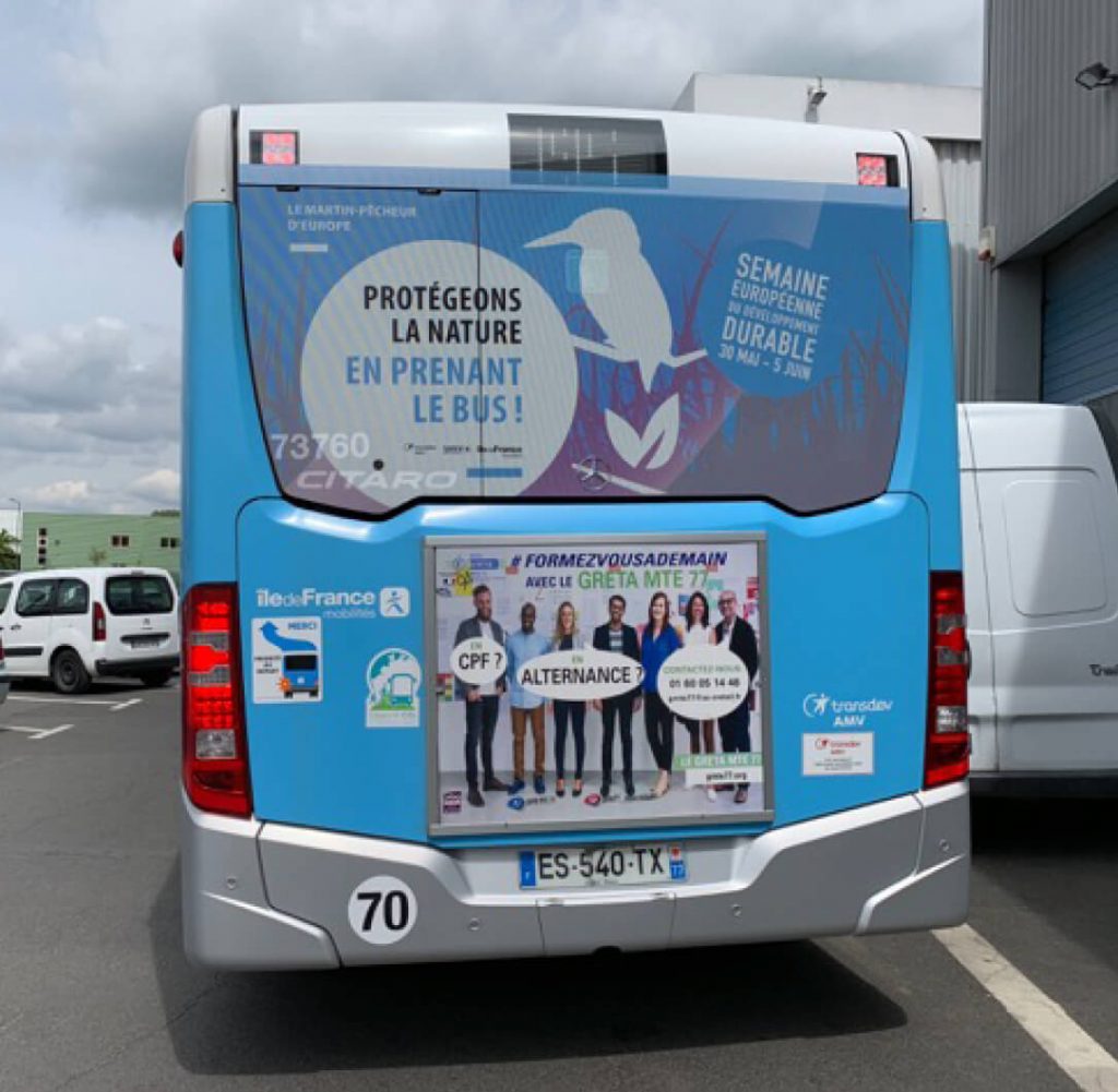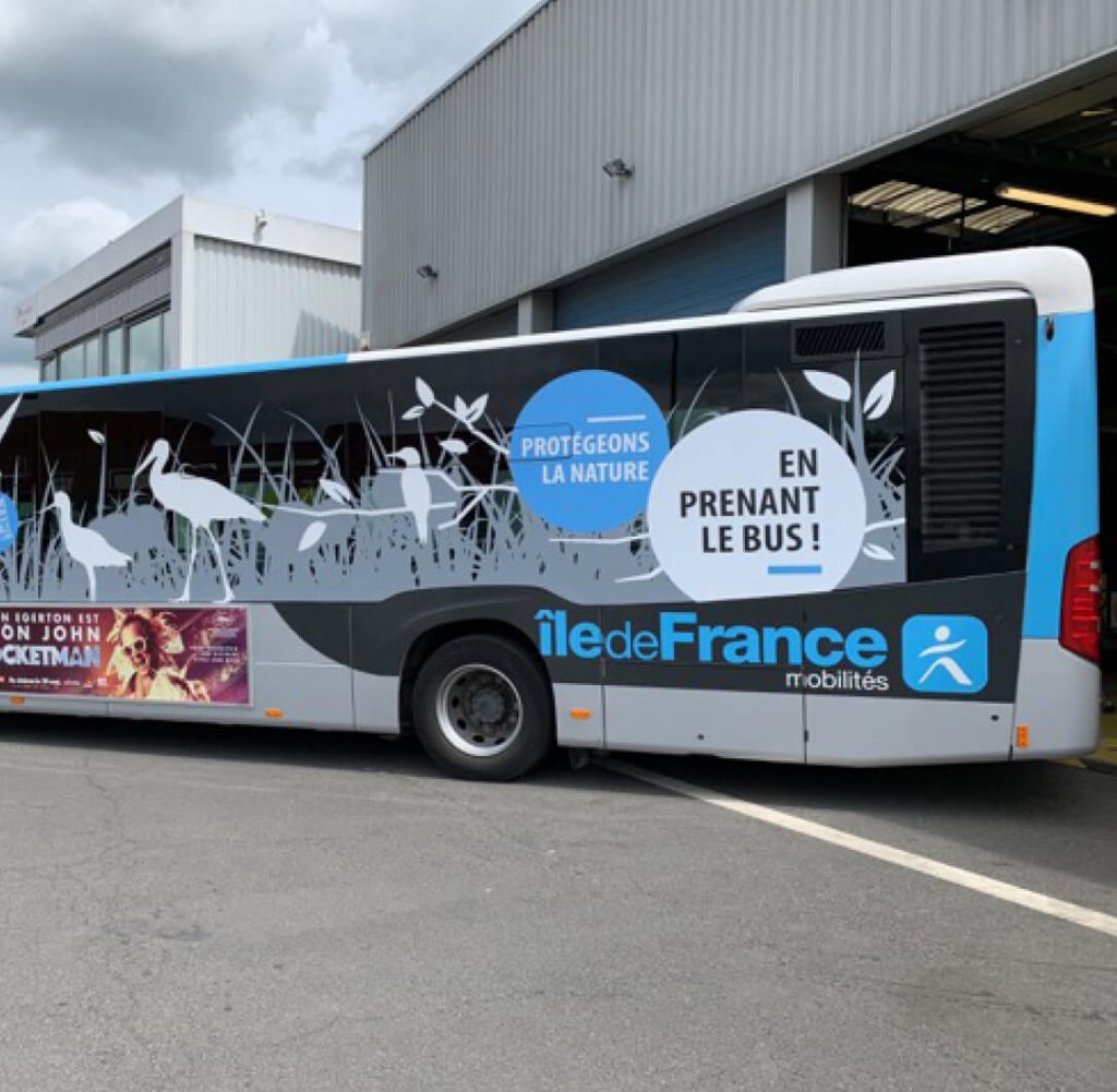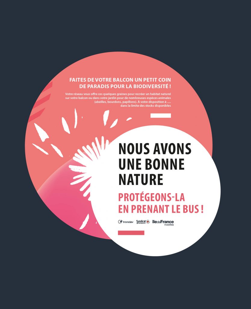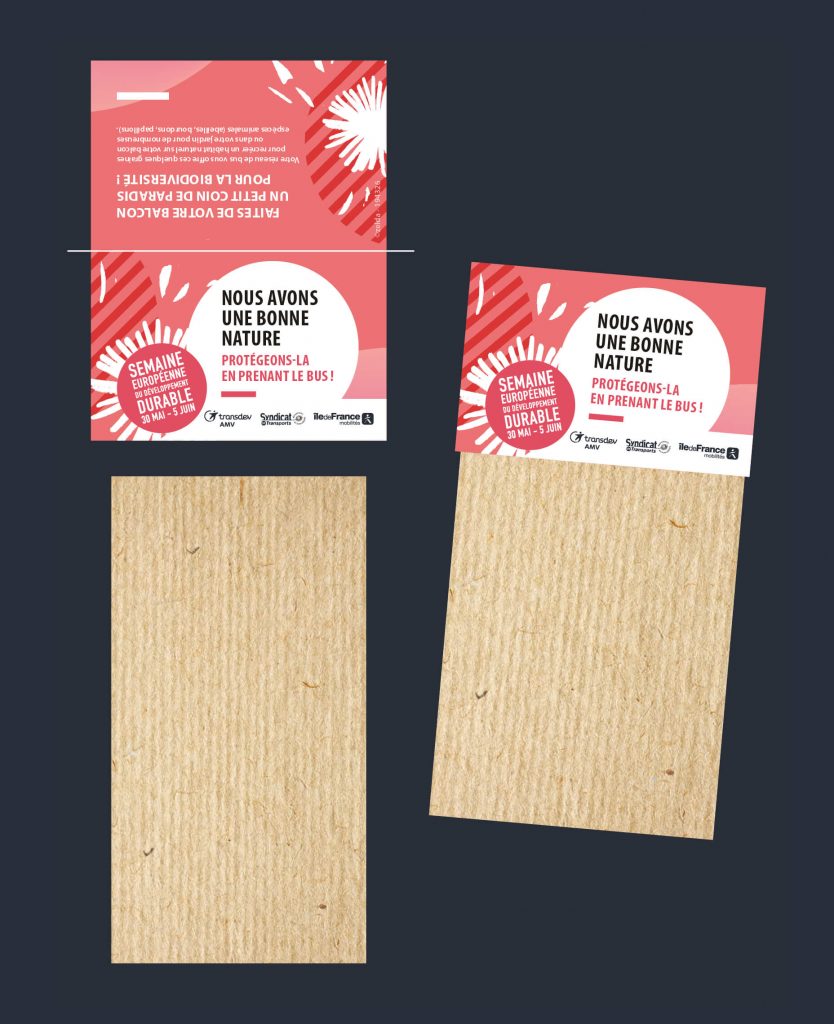 Conception et réalisation d’une campagne comprenant un covering véhicule, une communication embarqué et une distribution de sacs de graines afin de sensibiliser le grand public aux enjeux liés à la préservation de l’environnement en 2019 pour Transdev AMV à l’occasion de la semaine européenne du développement durable.