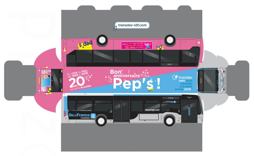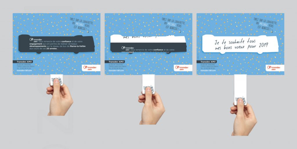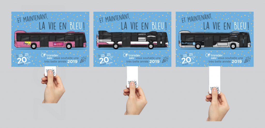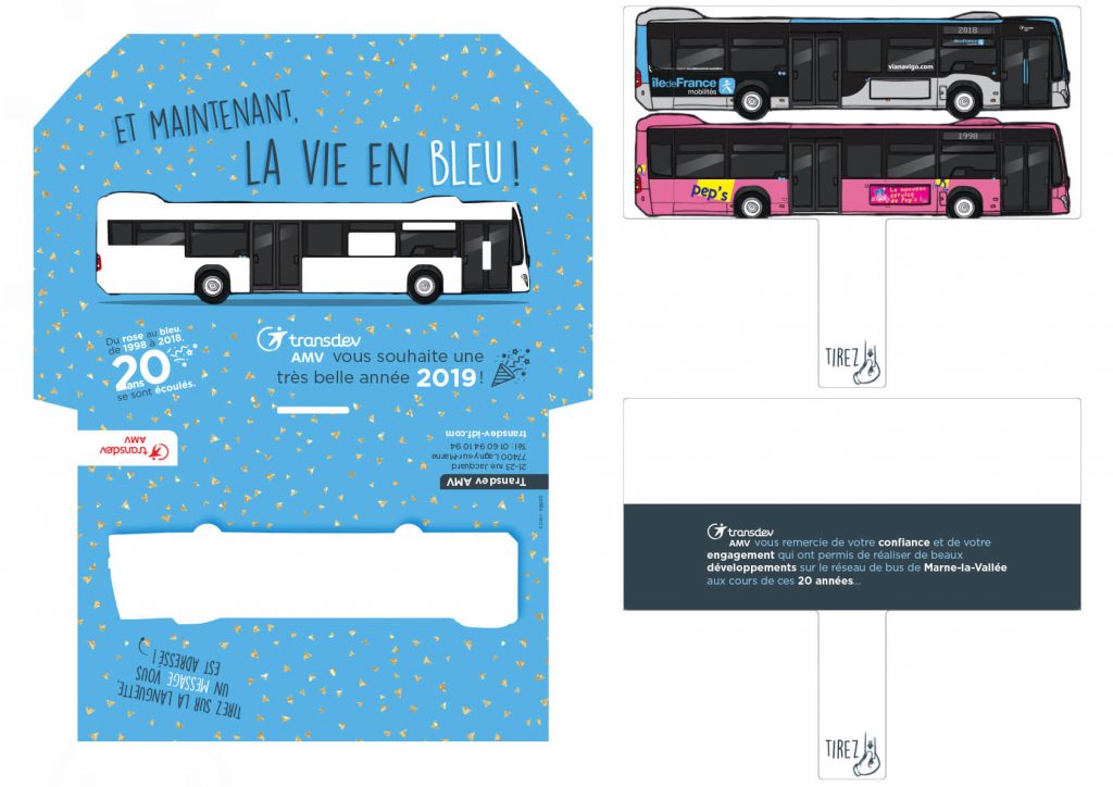 Conception et réalisation d’un papertoy (bus en origami à monter) afin d’annoncer le changement des coverings véhicules du réseau ainsi qu’une carte de voeux à tirette pour les voeux 2019 pour Transdev AMV.