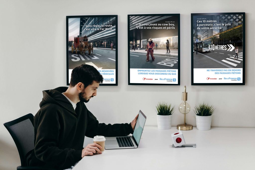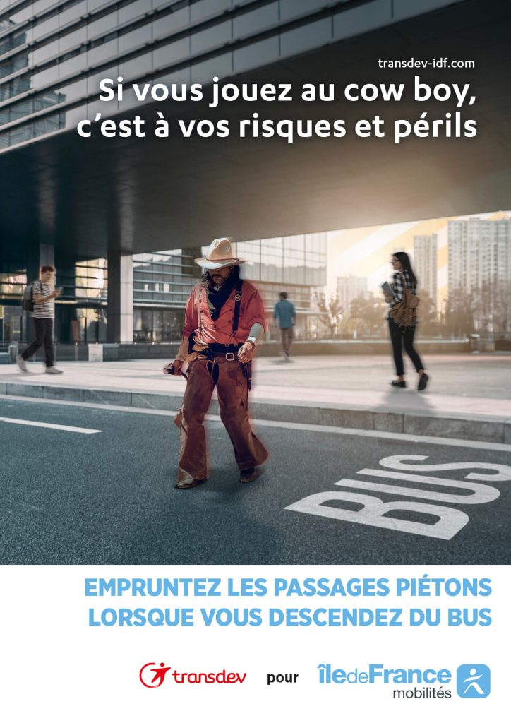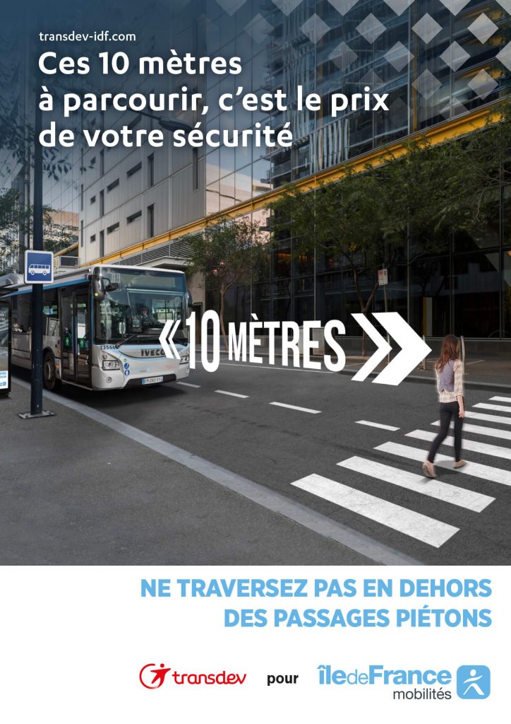 Conception et réalisation de campagnes pour la prévention des accidents sur différentes thématiques créatives suivant la charte IDFM (Île-de-France Mobilités) pour Transdev en 2019.