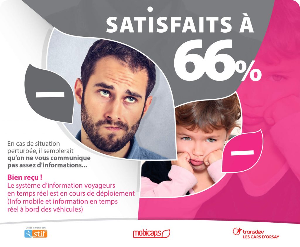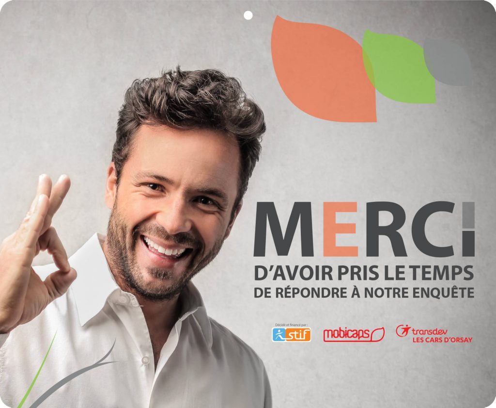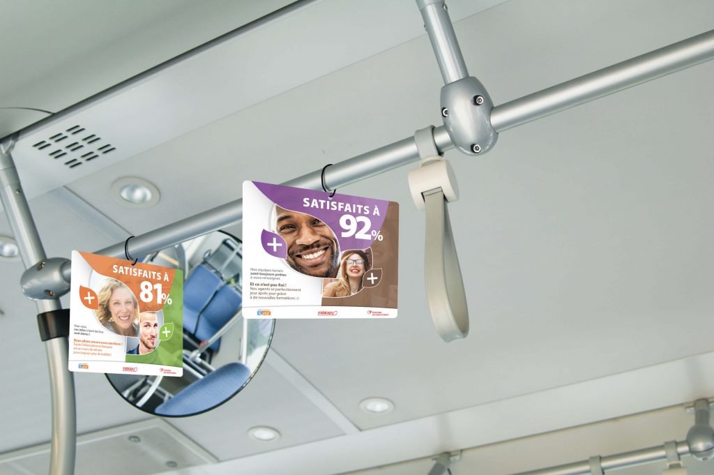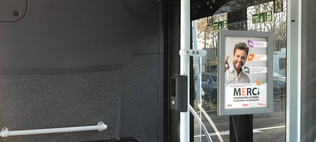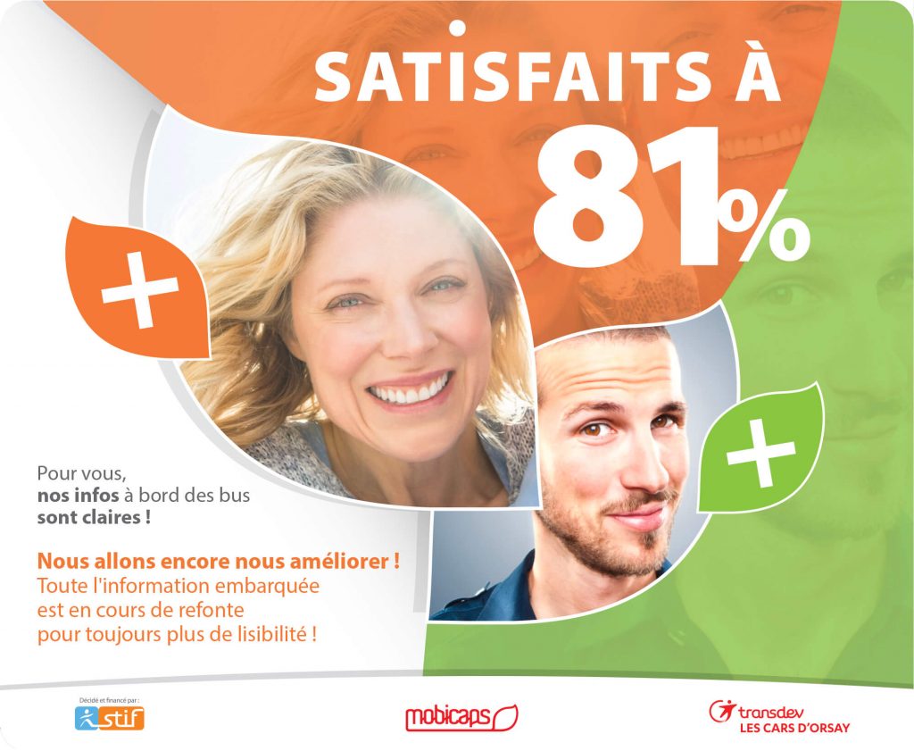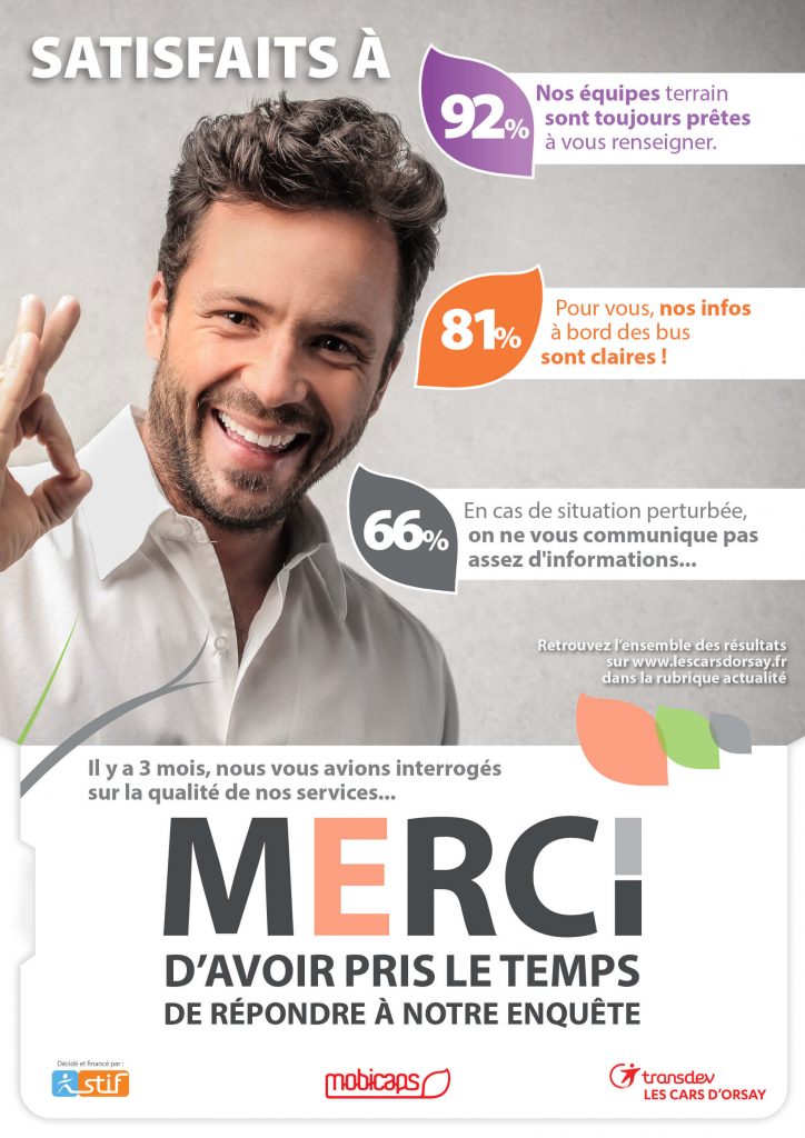 Conception et réalisation d’une campagne d’affichage à bord des bus sous forme d’affiche A4 et affichettes suspendues afin de diffuser les résultats de l’enquête satisfaction du réseau en 2016 pour Transdev Les Cars d’Orsay.