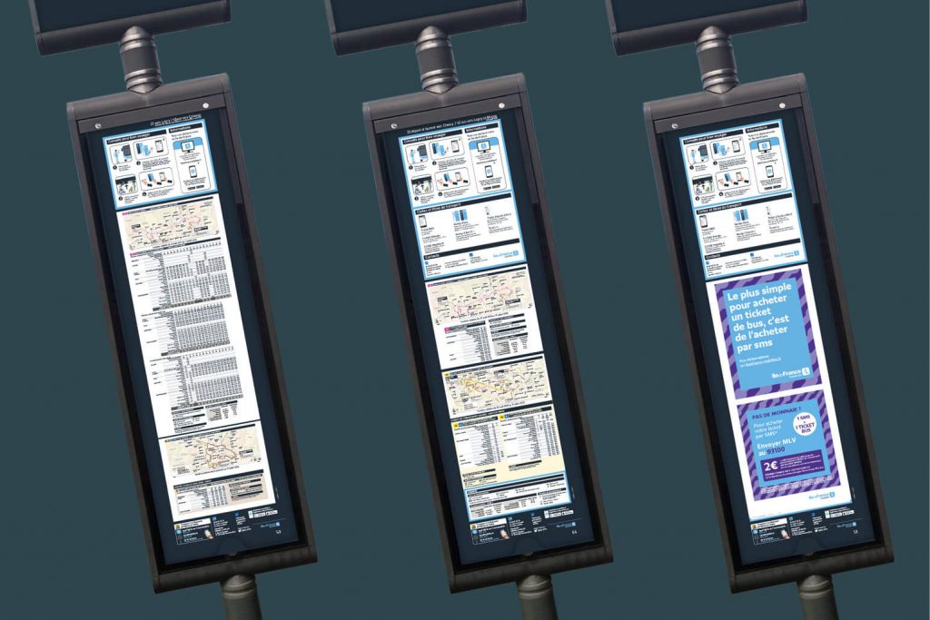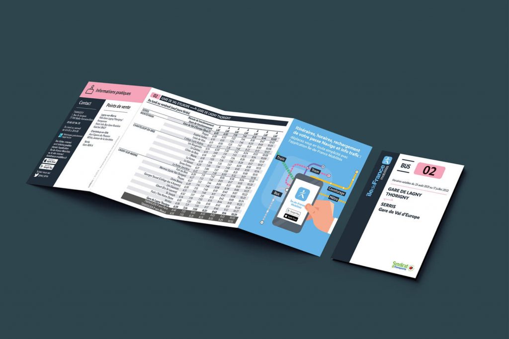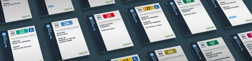 Réalisation et impression selon la charte IDFM (Île-de-France Mobilités) des fiches horaires papier et fiches horaires aux poteaux pour Transdev de 2014 à 2022.