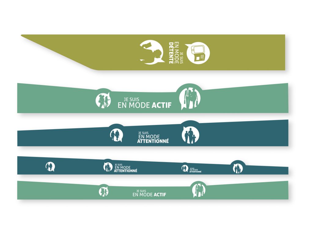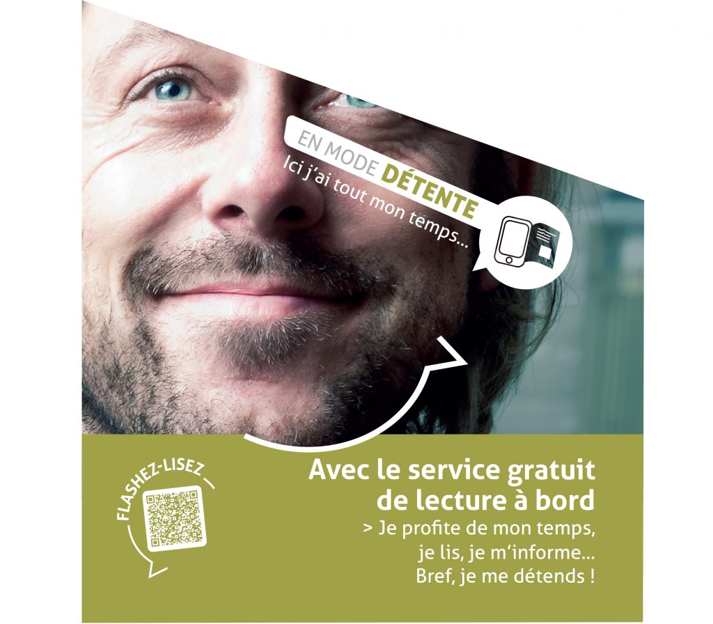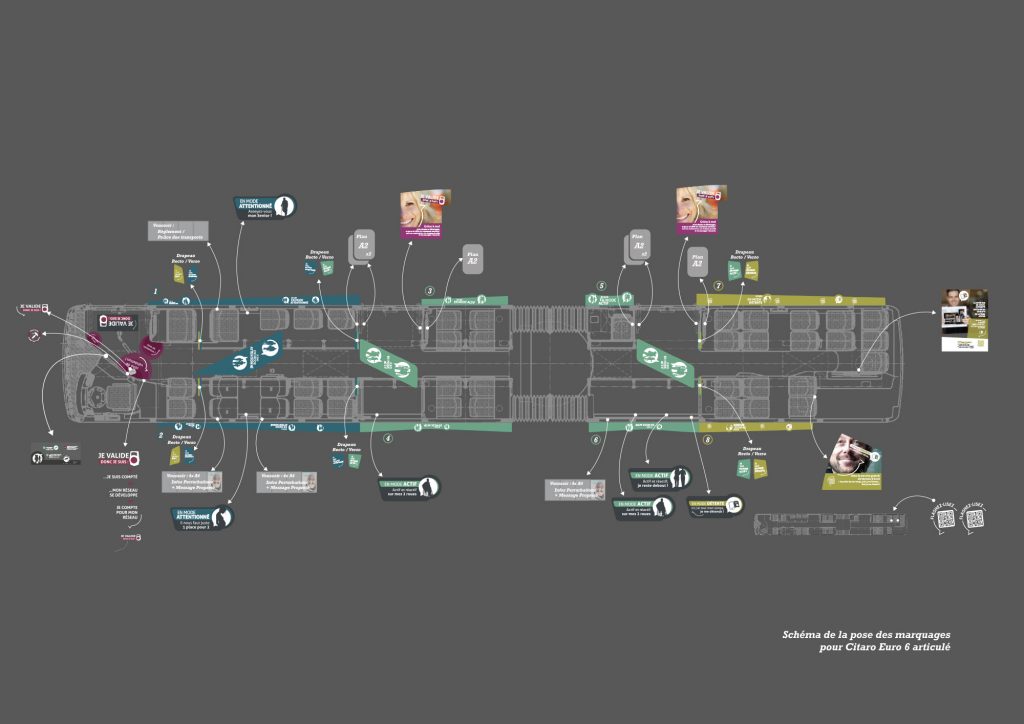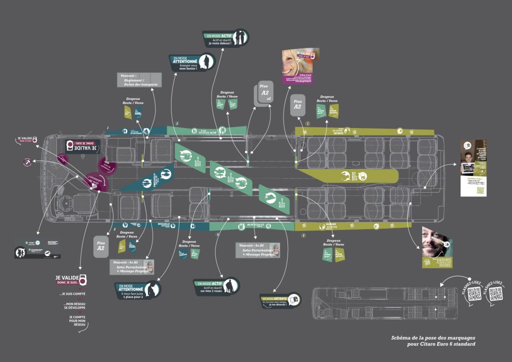 Conception et réalisation d’une segmentation des zones des bus pour les usagers avec différents types de marquages sols, voussoirs, affichettes suspendues, vitrophanies, jupe conducteur, lettres découpées, etc… pour Transdev Vulaines en 2015.